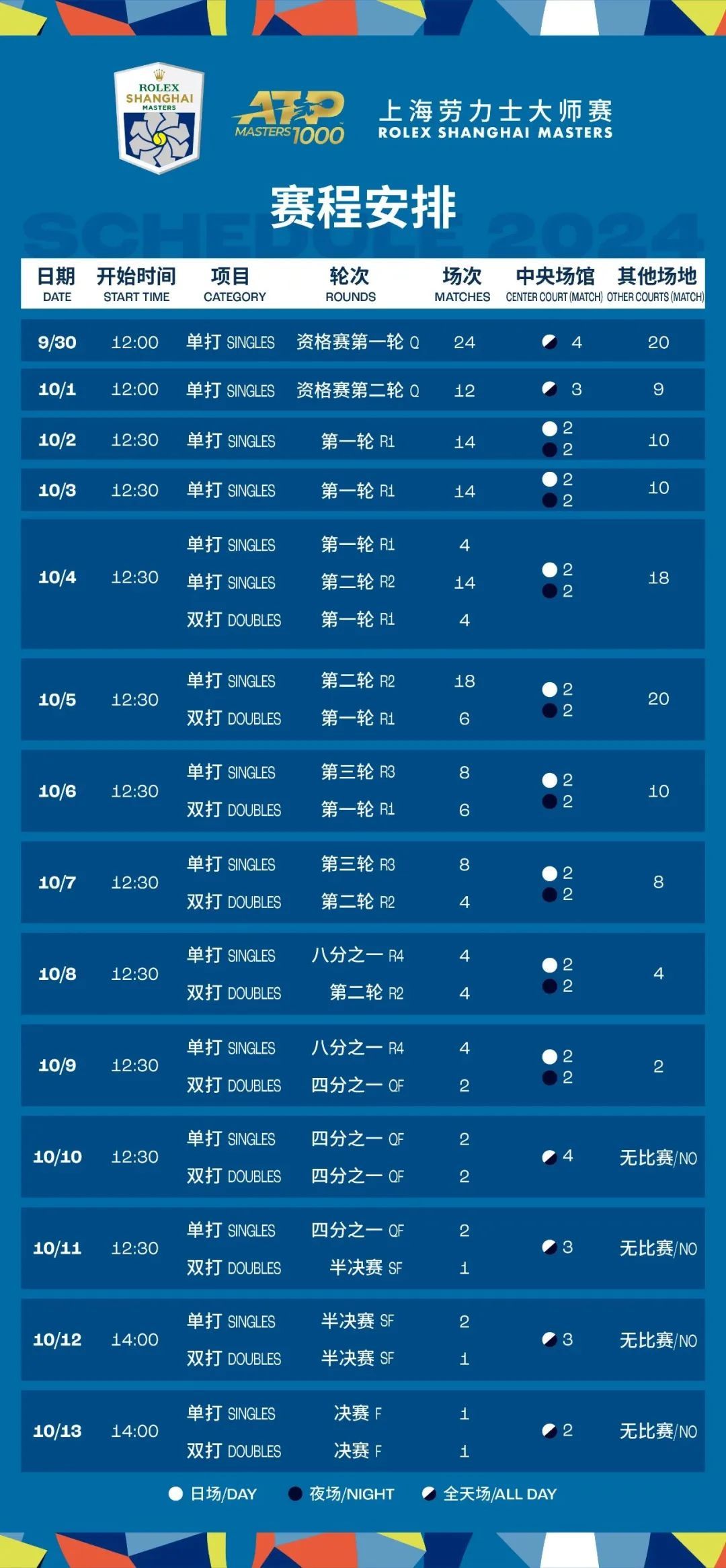 自去年起,上海劳力士大师赛已升级成为“超级大师赛”,赛程为14天(含2天资格赛),单打签表扩容至96人。今年的赛程将完整覆盖“国庆黄金周”,假日出行优选!