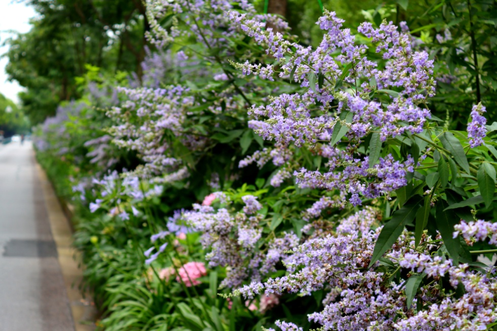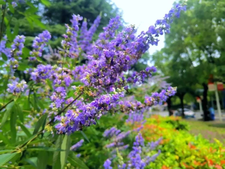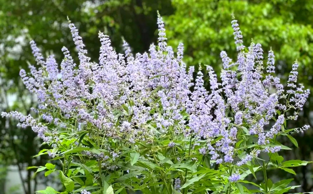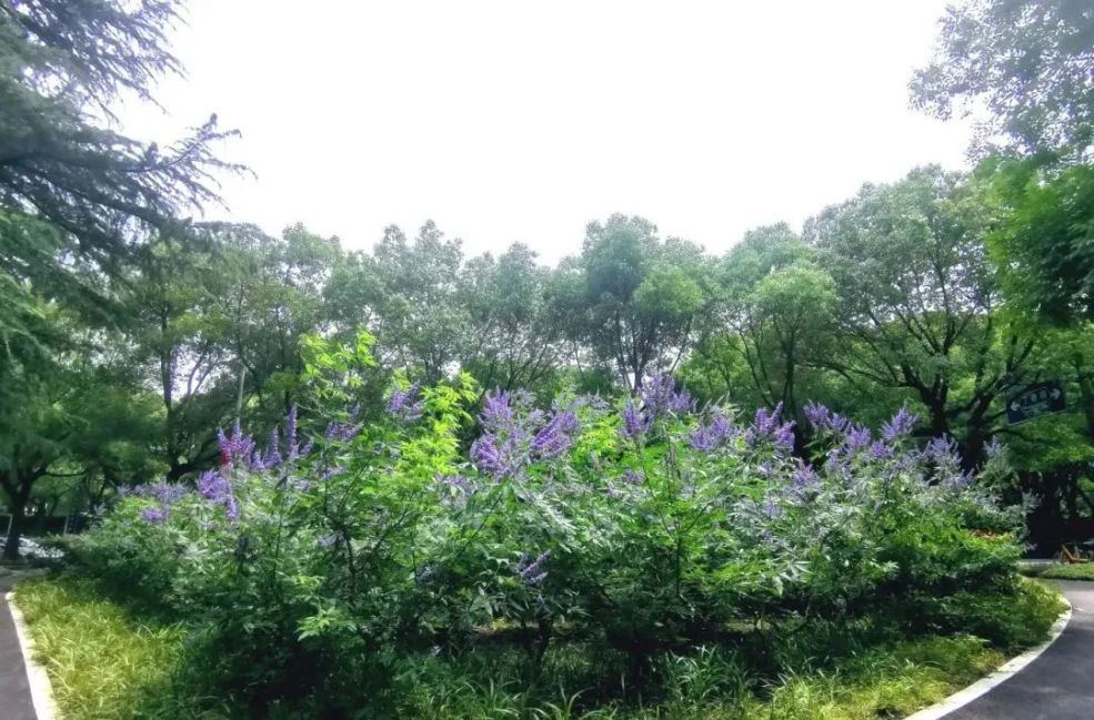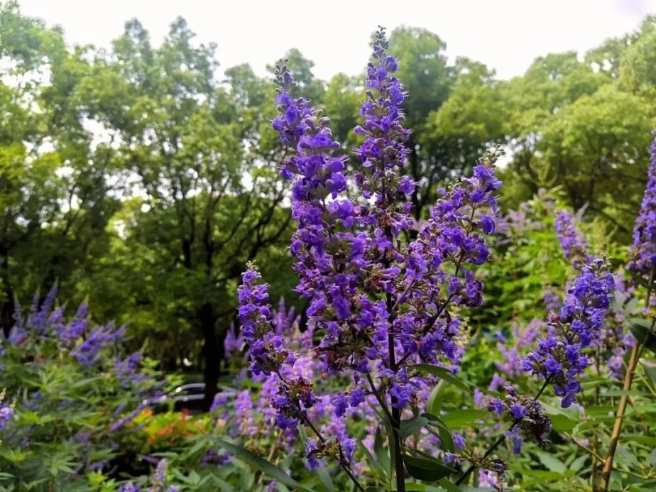 穗花牡荆,属马鞭草科、牡荆属灌木,高可达2至3米,具有耐修剪,花期长,抗逆性强的优点。既耐酷暑也耐寒冷,其叶子所散发出的芳香气味可驱蚊虫。且颜色鲜亮,花序大,花量多,长势旺盛,观赏价值极高,可孤植,也可片植,是公园、庭院、道路两侧十分优秀的冷色调花卉材料。