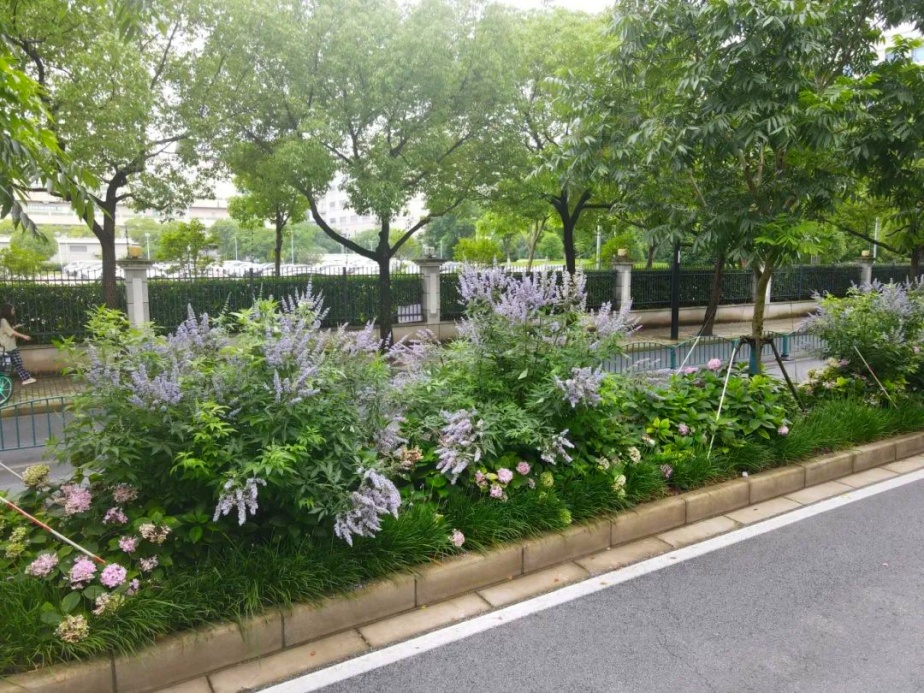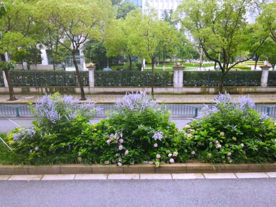 浦东新区合欢路5号地块绿地以及盛夏路(金秋路-张衡路)等均种有穗花牡荆。盛夏路的穗花牡荆搭配同色系的百子莲和绣球不惧骄阳,一同盛开,构筑出一幅蓝紫色的梦幻景色。
