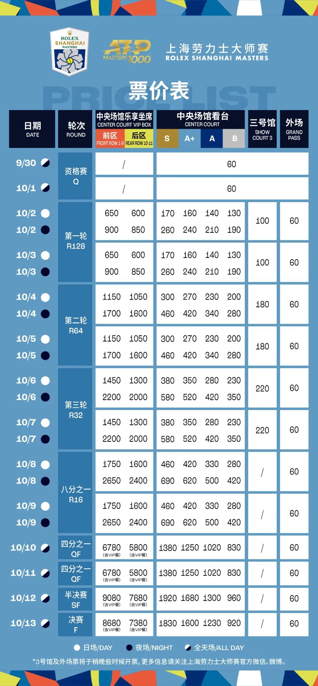 请大家注意,9月30日、10月1日两天的资格赛以及从10月10日四分之一决赛起,赛票不作日夜分场。