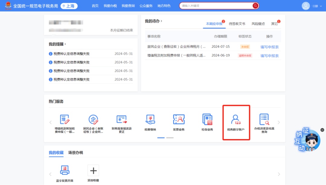 您也可以通过“热门服务”下方【税务数字账户】模块跳转到税务数字账户概览界面,依次点击【账户查询】-【申报信息查询】-【未申报查询】查看。