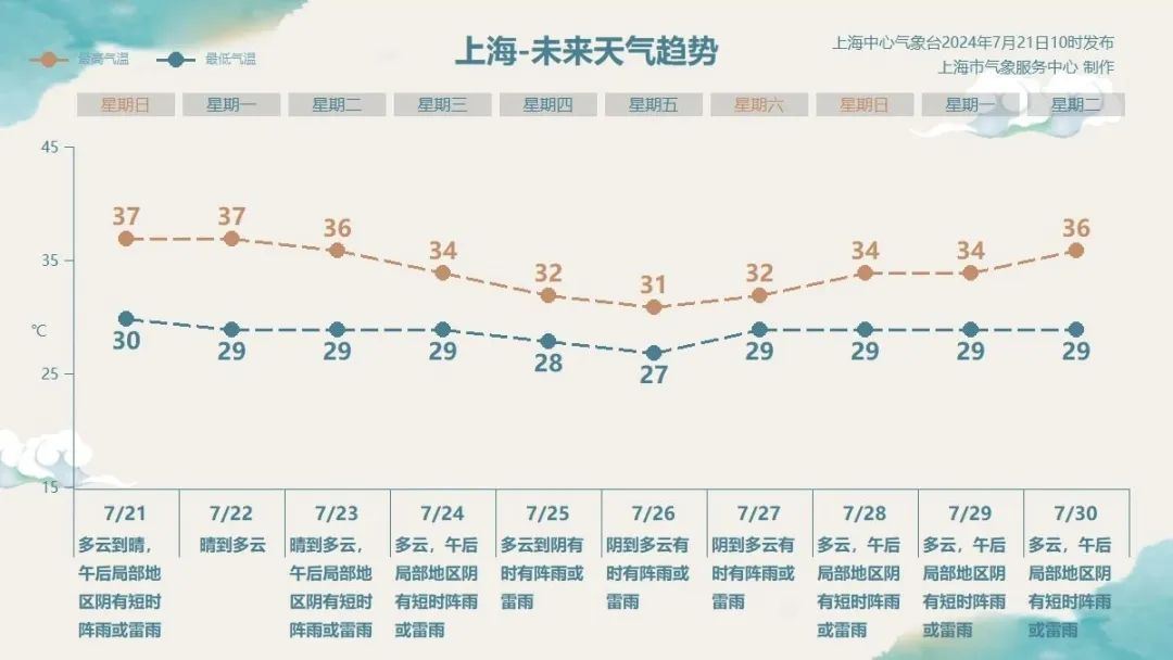今天(7月21日)依旧是热浪滚滚的一天,早晨云系较多,上午起以多云天气为主,午后局部地区出现短时阵雨或雷雨天气。上海中心气象台2024年07月21日12时35分更新高温黄色预警信号为高温橙色预警信号,受副热带高压影响,本市大部分地区最高气温超过37℃。