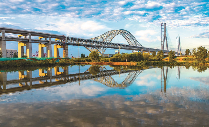 7月21日,长江上首座集高速公路、城际铁路、普通公路于一体的过江通道—常泰长江大桥主航道桥钢桥面铺装施工有序推进。 计海新 摄 (视觉江苏网供图)