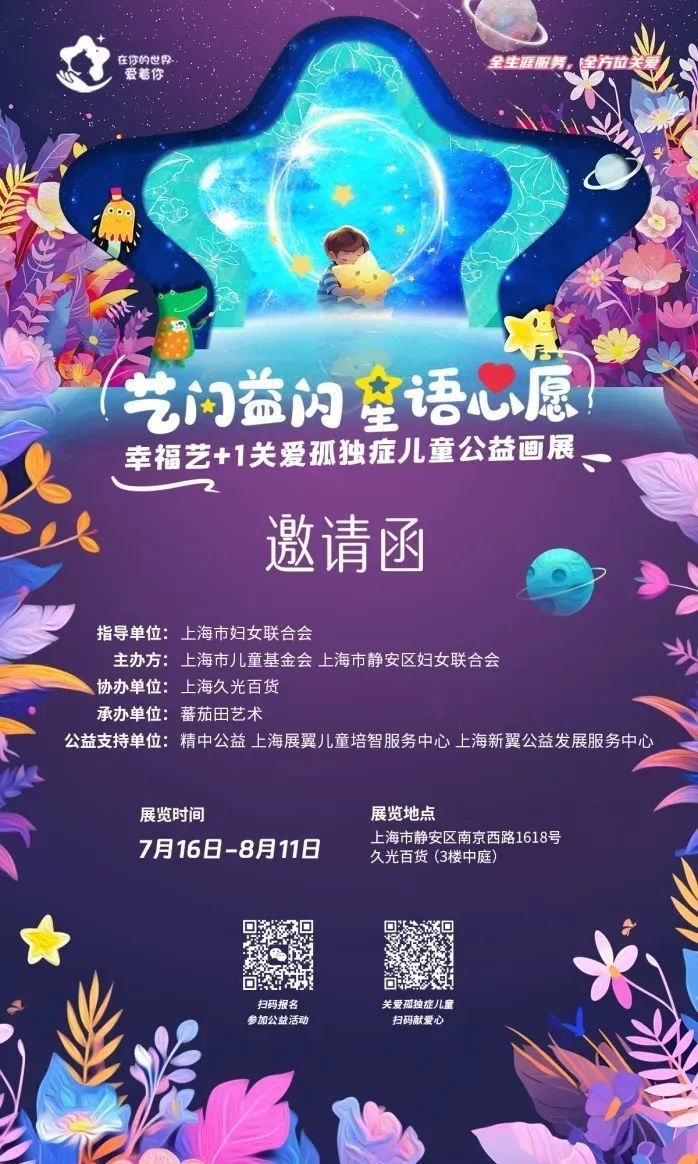 此次展览名为“艺闪益闪,星语心愿 幸福艺+1关爱孤独症儿童公益画展”。在上海市妇女联合会指导下,由上海市儿童基金会、静安区妇女联合会主办,蕃茄田艺术策划及承办,上海久光百货协办,精中公益、上海展翼儿童培智服务中心、上海新翼公益发展服务中心为公益支持单位共同举办。