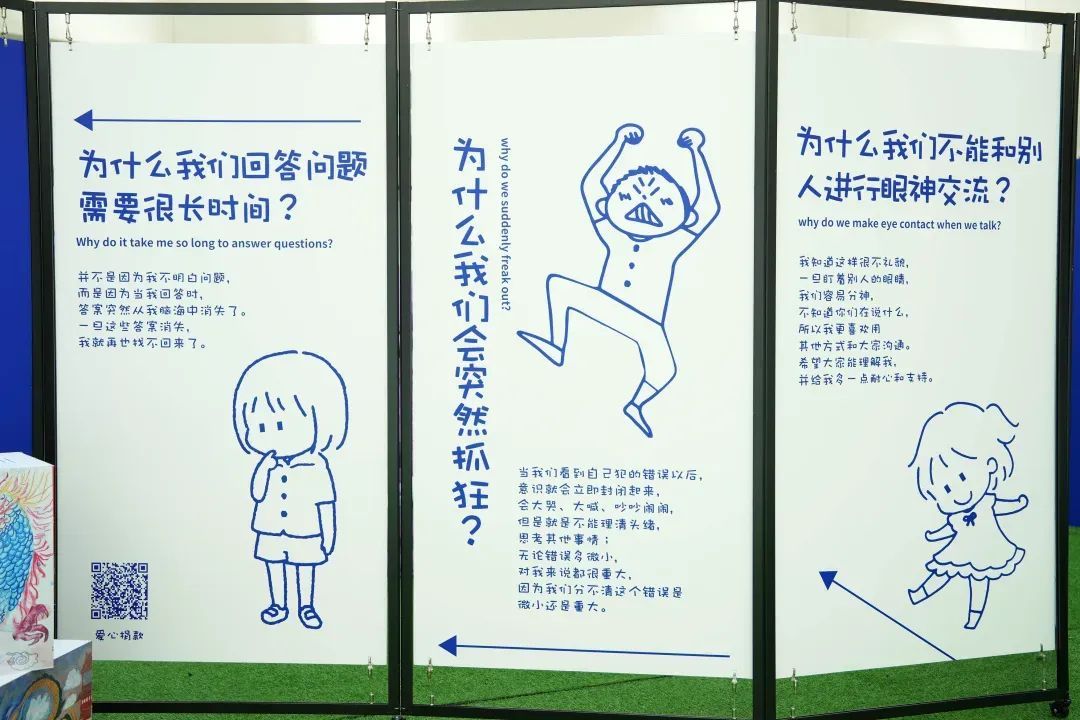 除了108幅画作,展览还采用了漫画与作品结合的形式,来演绎“孤独症的十万个为什么”,用艺术的语言表达感受和想法。