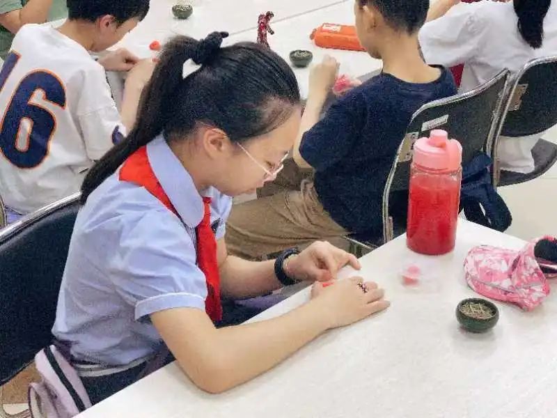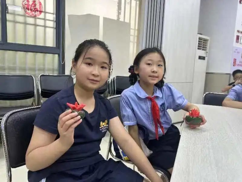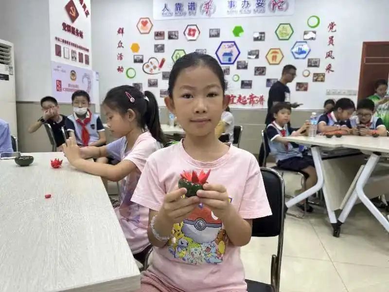 在老师的指导下,孩子们发挥创意才能,大胆创作,“捏、搓、揉”一连串动作之后,一盆盆用“面塑”技艺制成的多肉植物“火祭”呈现在课桌上,惟妙惟肖的株形,叶色火红,配上小巧的花盆形态逼真,看着亲手制作的面塑植物,孩子们既惊喜又兴奋。