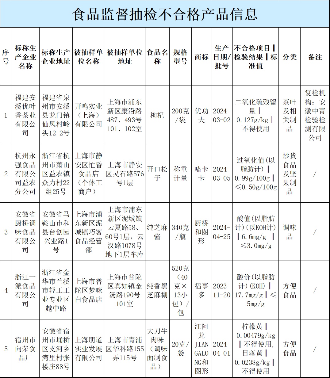 上海市市场监督管理局2024年 第24期省级食品安全抽检信息