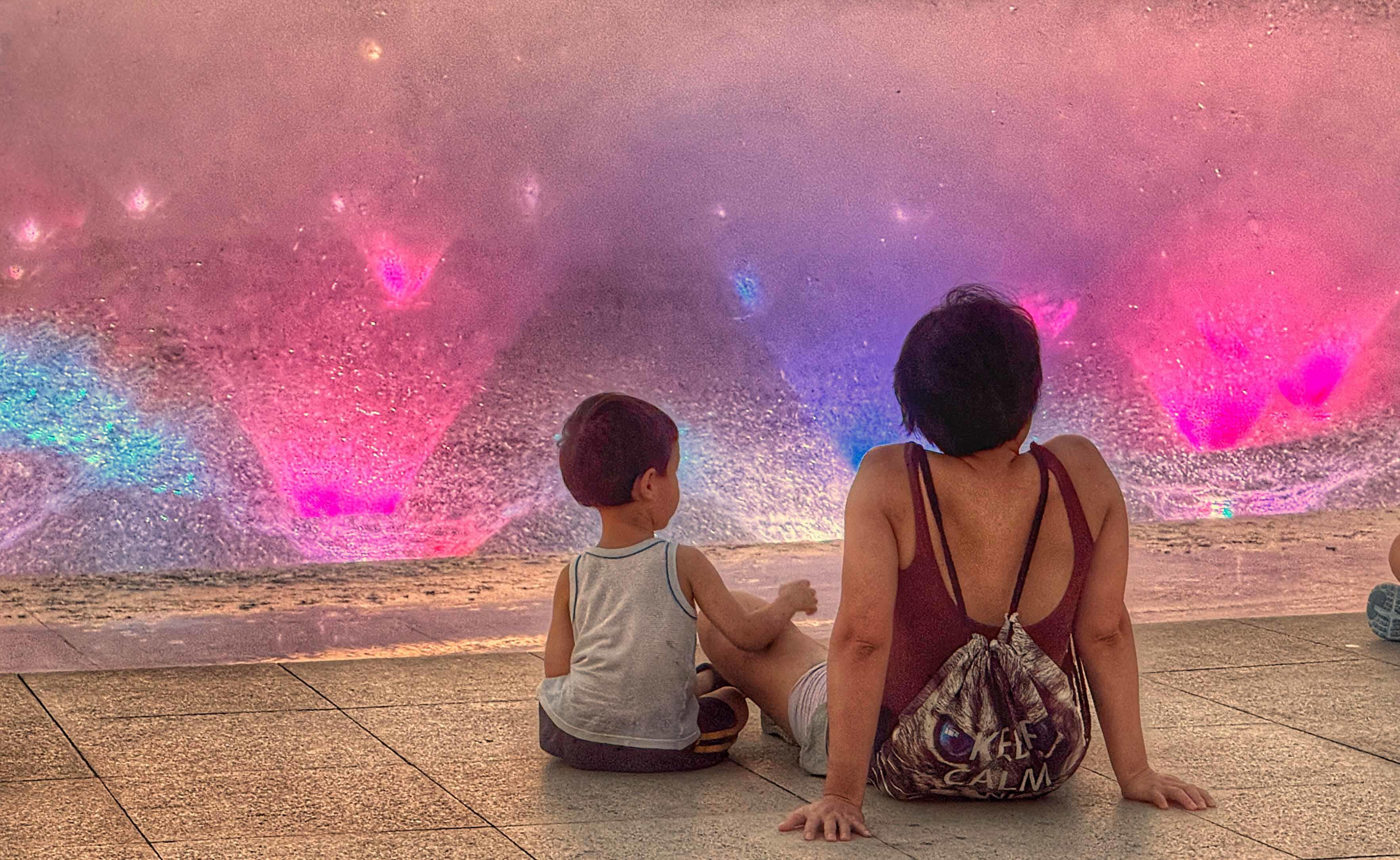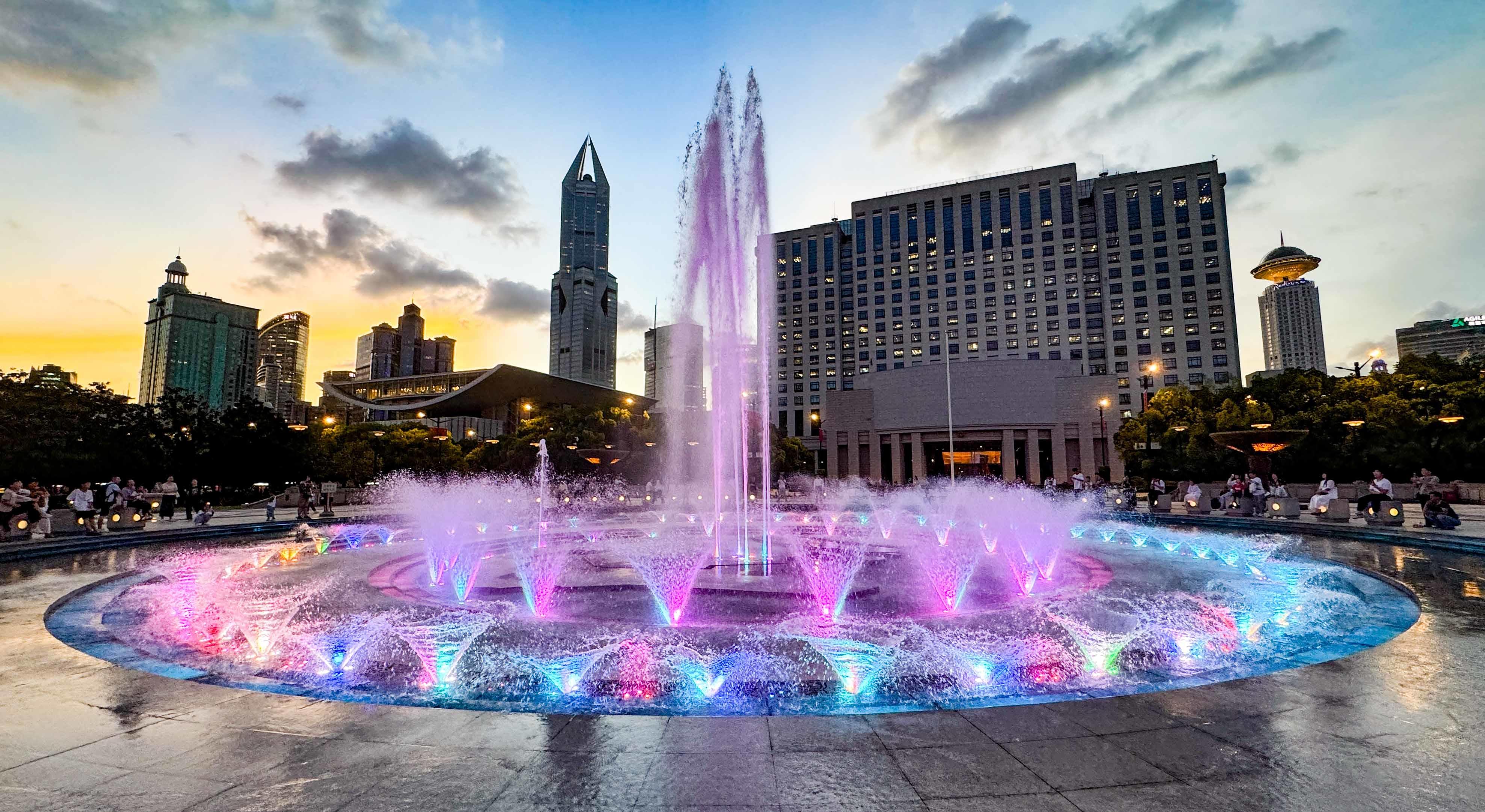 缤纷夏日,人民广场的音乐喷泉每日整点准时绽放。众多市民和游客汇聚于此,欣赏这壮观的景象。喷泉随着音乐的节奏起伏摆动,灯光与水花相互辉映,营造出一个绚丽多彩的梦幻空间。