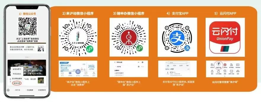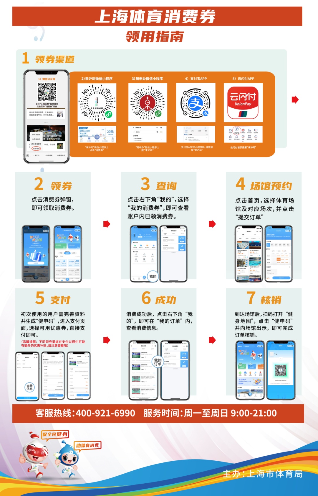 市民可以通过“上海体育”政务微信、“来沪动|健身地图”微信小程序、“随申办”微信小程序、支付宝APP、云闪付APP等渠道领用体育消费券,享受直接抵扣优惠。