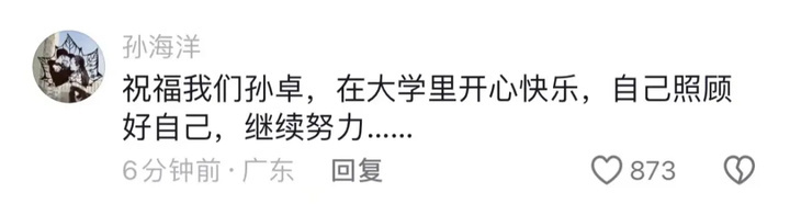 在孙卓的视频评论区里,孙海洋留言:“祝福我们孙卓,在大学里开心快乐,自己照顾好自己,继续努力……”孙卓的妈妈也留言表示:“恭喜恭喜”。