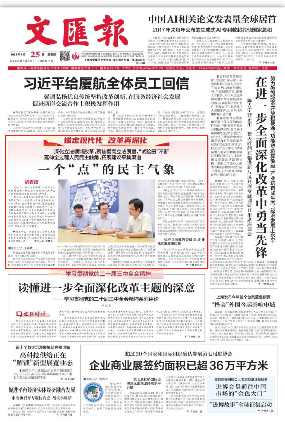2024年7月25日出版的《文汇报》头版刊登了题为《一个“点”的民主气象》的报道。民营企业皓元医药董事长郑保富的手机里有一份“划重点版”法规。数十条涉及生物医药产业的相关法条被凝练归结为“多元化投资”等关键词。结合实践,郑保富很快找到了对于具体法条的建言靶心——建议加快培育面向新兴产业的耐心资本,丰富金融服务支撑,并将其与金融机构考核挂钩,避免好政策在执行层面“差一口气”。近日,施行两年的《上海市浦东新区促进张江生物医药产业创新高地建设规定》启动执法检查——简单来说,这是为了回应产业发展新变化,更好吸纳创新主体建议,为完善法规、修改法条奠定基础。浦东新区工商联基层立法联系点为企业量身定制了“简易辅读版”,便于科学城内的创业者、市场主体等能高效捋清法规所指所向,也更有针对性地给出建议。面向新兴领域需求,浦东新区工商联基层立法联系点不断延伸全过程人民民主的触角,将立法信息采集点嵌入张江科学城。一年来,采集点充分立足“用户视角”,优化建议采集渠道,也从立法中向立法前、立法后延伸。