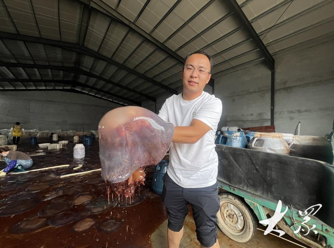 7月16日记者见到了刚从渔港收完海蜇回来的王晓辉,“忙得三天没怎么睡了,想保证海蜇新鲜,加工时效最为重要,捕捞上来不抓紧处理就化掉了。”
