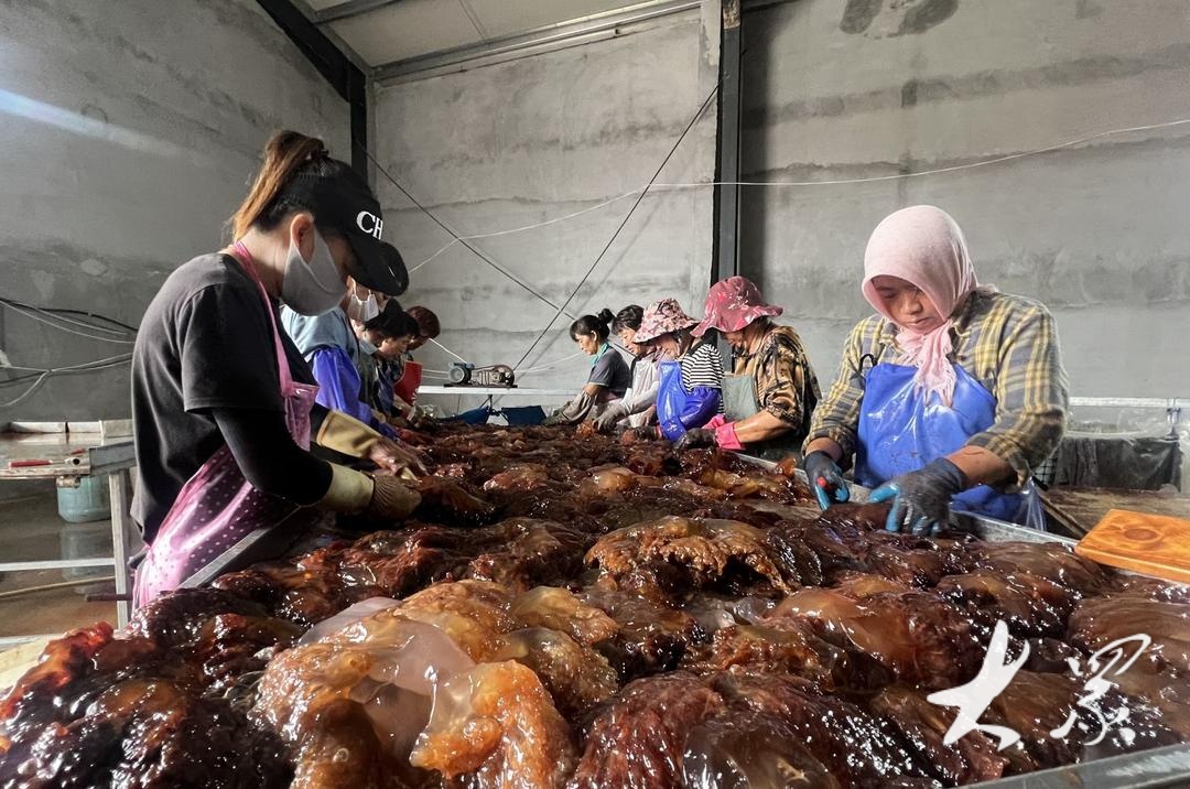 在冯家镇的海航水产品有限公司,每天近5吨的海蜇在这里经过选料、漂洗、脱盐脱矾、杀菌、沥水、配料、包装等一系列无菌工艺加工,最终变成开袋即食的美味。