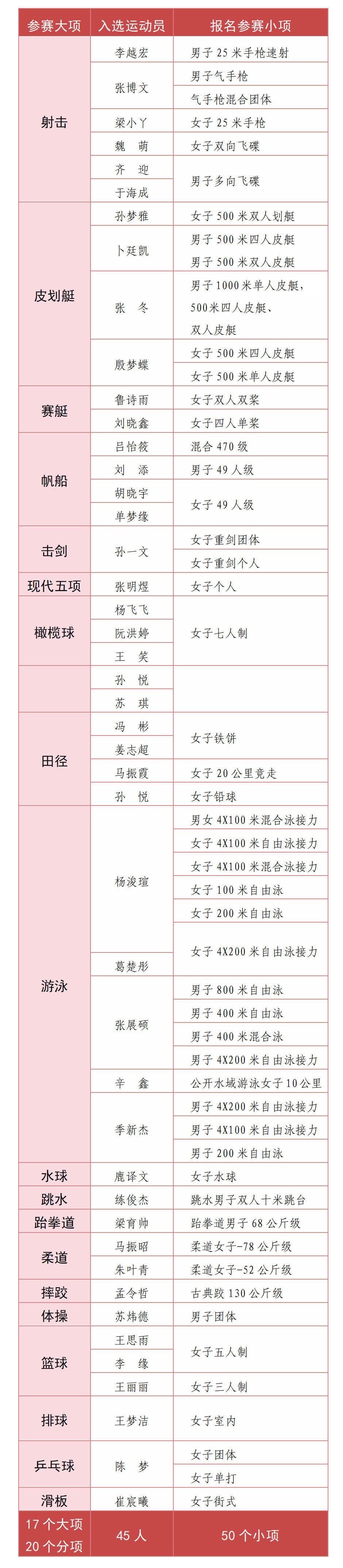 我省共有45名运动员(女子32,男子13)入选中国奥运代表团,占代表团运动员总数的11%,将参加乒乓球、射击、体操、击剑、游泳、皮划艇、赛艇、柔道、帆船、田径、摔跤、排球、篮球、橄榄球、现代五项、跆拳道、滑板共17个大项、20个分项、50个小项的比赛。另外,我省有15名教练员和2名工作人员入选奥运代表团。