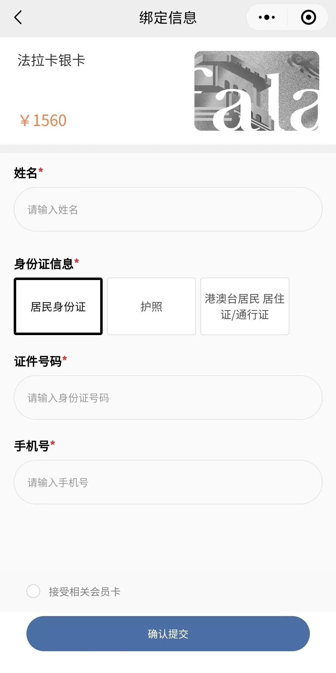 1、扫描下方二维码进入会员卡页面,点击【法拉卡金卡/银卡】-【立即购买】。