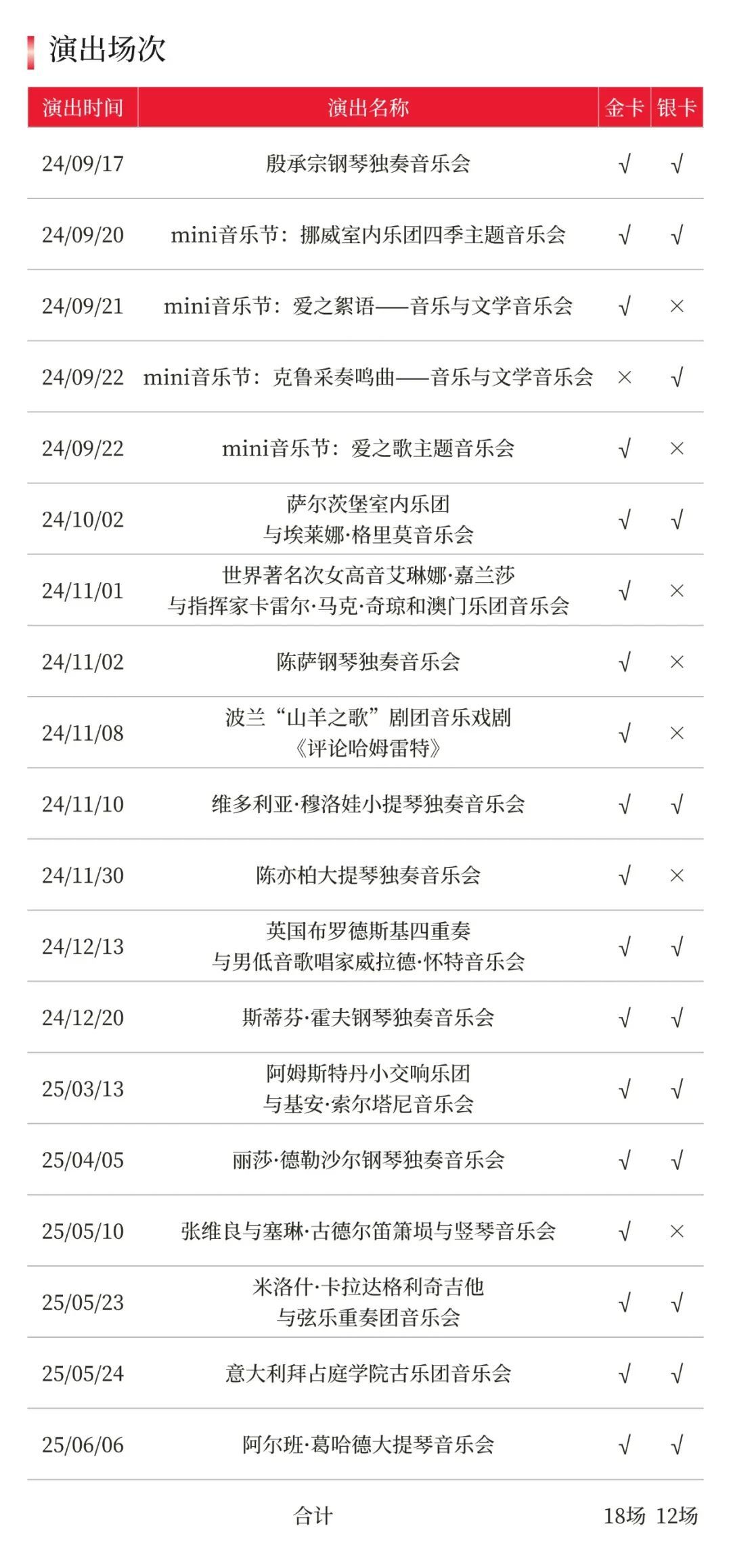 4. 持卡会员可观赏2024-25音乐季中的指定音乐会,每卡每场各1张,每场座位会在280元票价及以上的座位中择优出票,不支持选座,指定音乐会详见清单。