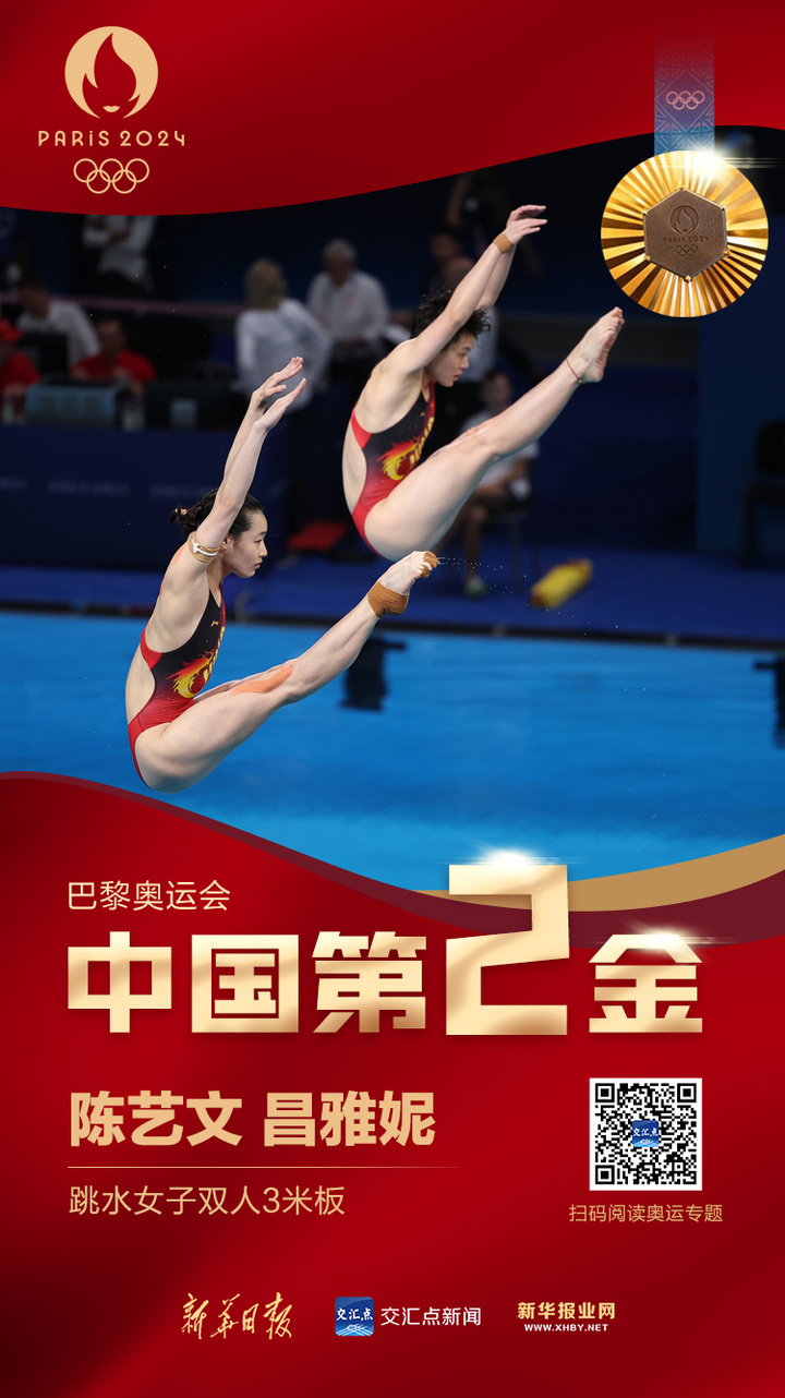 7月27日,在巴黎奥运会跳水女子双人3米板比赛中,中国组合陈艺文/昌雅妮提前锁定金牌。