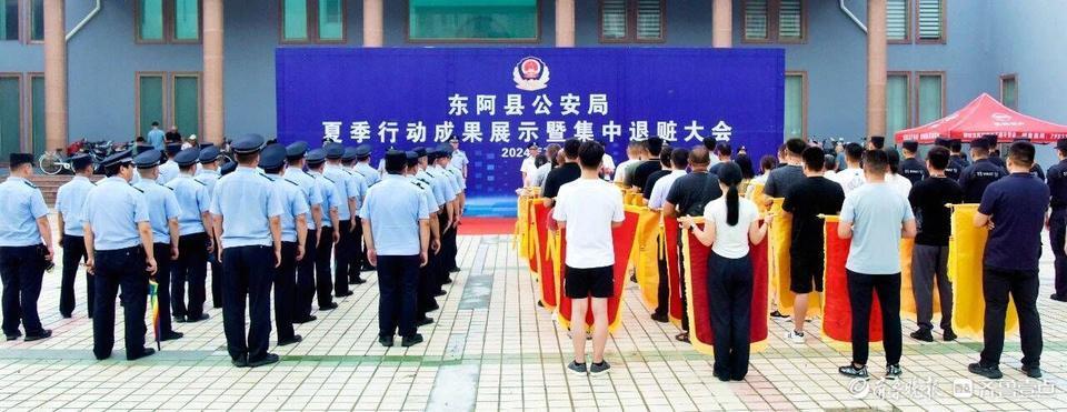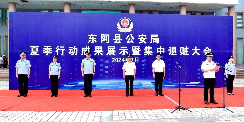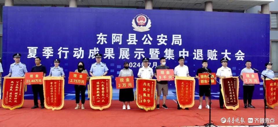 7月25日,东阿县公安局在东阿广场隆重举行夏季治安打击整治行动集中退赃大会,展示小案侦防专项行动和夏季治安打击整治行动战果,将追回的赃款赃物集中返还受害群众。