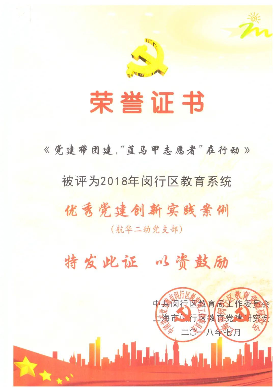 先后荣获上海市幼儿园创意艺术语言表演赛金奖、上海市亲子绘本朗读表演展示活动优秀组织奖、上海市幼儿小青蛙讲故事比赛获一等奖、亲子嘉年华活动“上海市第十二届幼儿游戏大赛”最佳游戏奖、闵行区幼儿快乐体操比赛“幼儿快乐操”团体二等奖、闵行区第二届幼儿趣味自行车比赛获团体一等奖、闵行区沪语小达人比赛一等奖等。