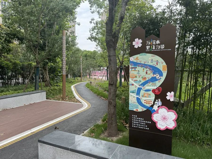 2023年,万里街道就对大场浦河沿岸改造项目开展了广泛的人民建议专项征集。如今,绵延2.1公里的“万里滨水活力带”散落着周边居民的设计灵感。漫步在崭新蜿蜒的河畔,居民倍感舒心亲切。