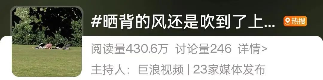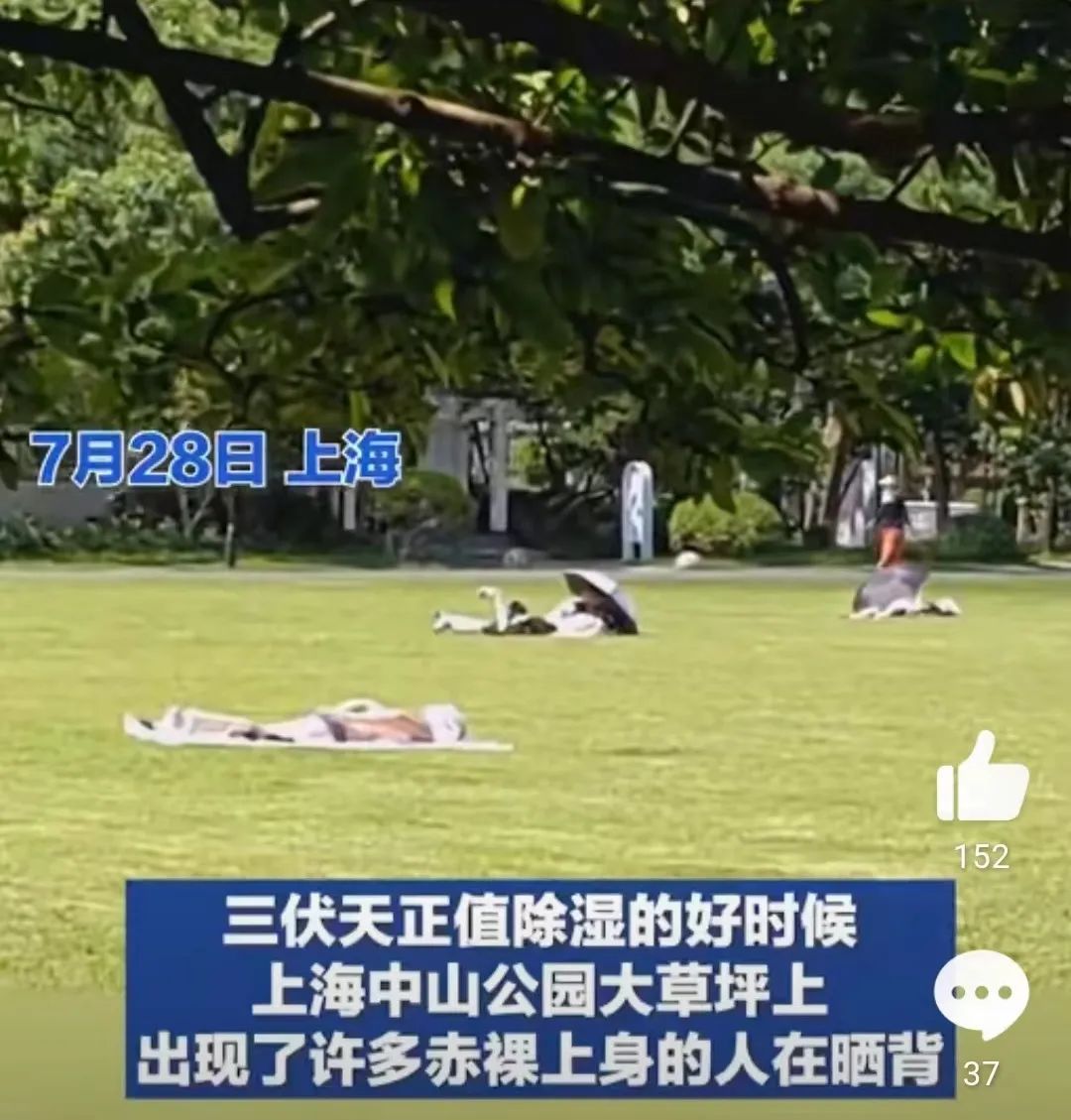 近日,上海中山公园大草坪上,出现了许多赤裸上身的人在晒背。网友直呼,晒背的风还是吹到了上海,在魔都的公园晒背好city啊。