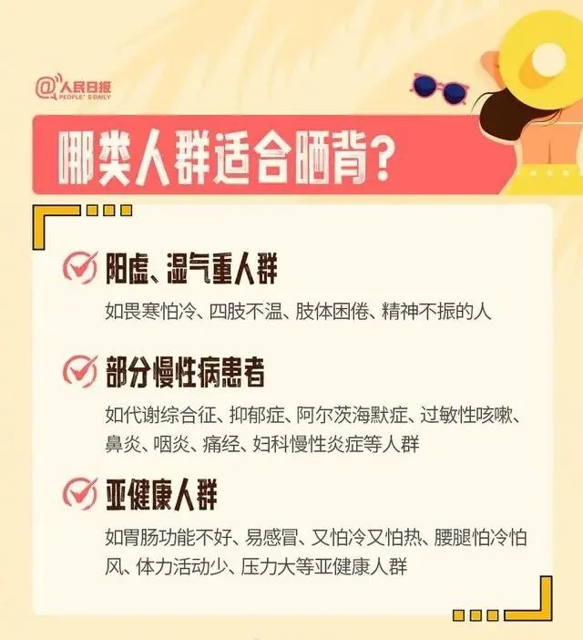 长沙市第三医院中西医结合科副主任、主任医师肖智认为,晒背对于日常表现为畏寒、脸色苍白、大便不成形、大便稀溏、脸浮等人群能起到提高体质的作用;适当晒背也可补充维生素D。