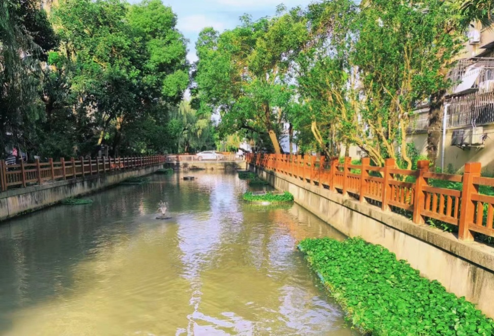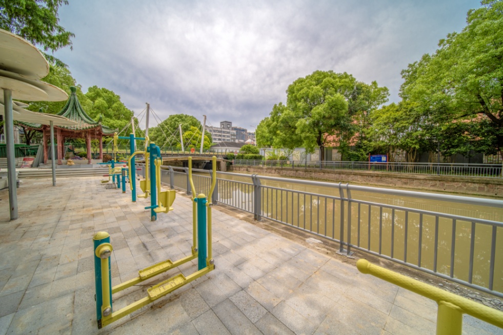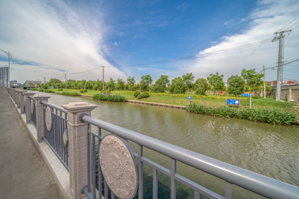 护城河(惠新港-卫星东路)新建栏杆4672米,栏杆图案结合了惠南镇的本土化元素,展现出城市的文化底蕴和审美水平,增强惠南整体魅力。同时,亲水平台改造让这里成为亲近自然、休闲健身的好去处,周边居民可以沿着河道散步或骑行,一边欣赏沿岸风景,一边感受自然的美好。