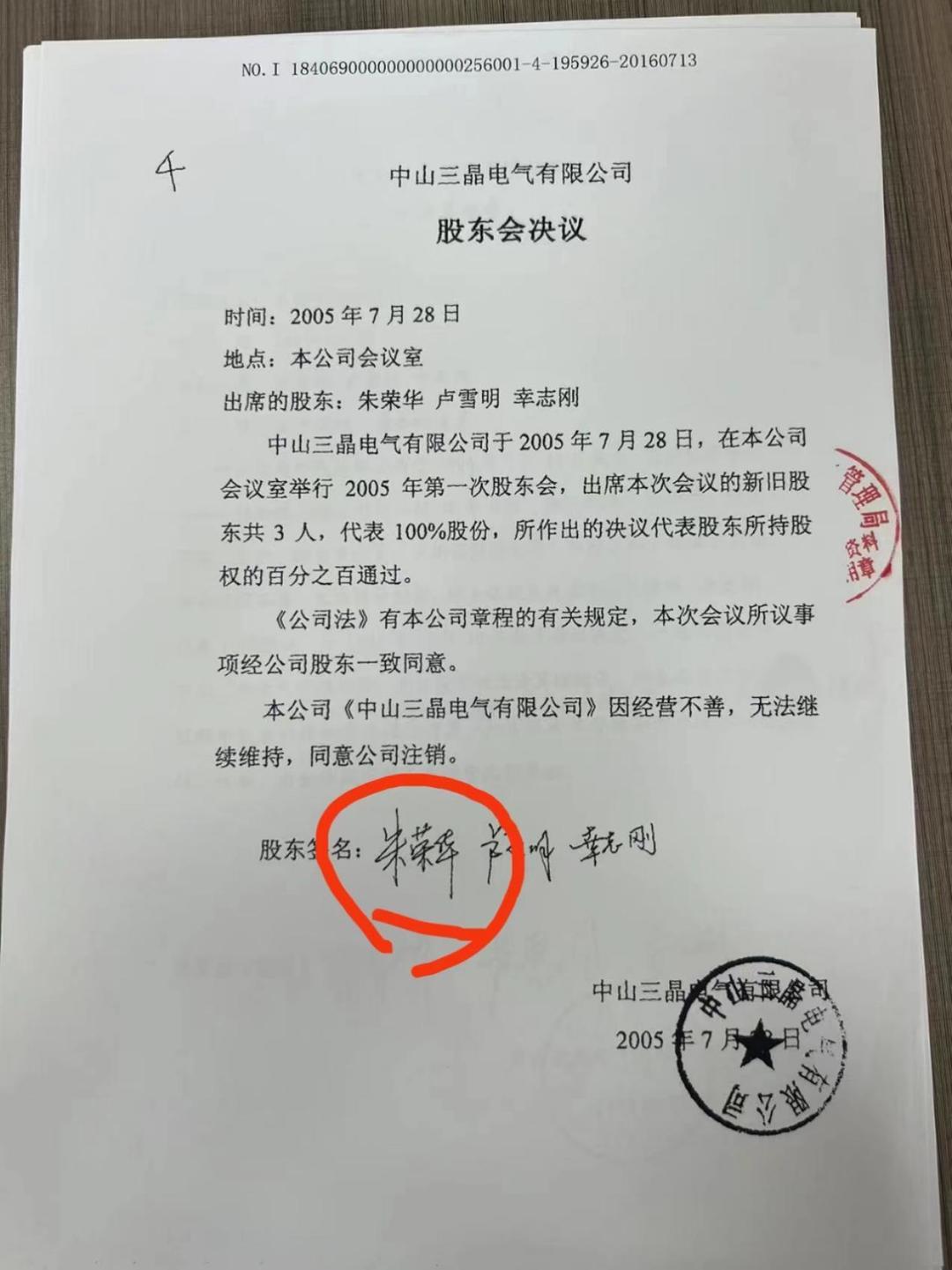 朱荣华称,2013年,自己去中山工商局调取中山三晶的档案,才发现卢雪明和幸志刚于2005年9月先成立广州三晶(三晶股份前身),把中山三晶所有的资产、设备、业务等转移到广州三晶,然后他们在2005年11月伪造自己的签名,将中山三晶注销了。