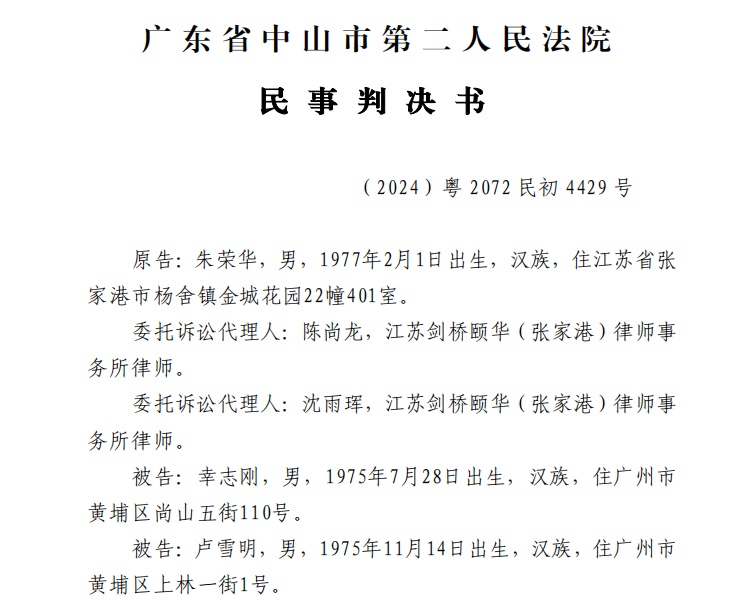经济导报记者7月24日从有关方面获取的中山市第二人民法院今年6月27日签署的《民事判决书》【(2024)粤2072民初4429号】显示,该案件为“原告朱荣华与被告幸志刚、卢雪明公司决议纠纷案”,于2024年4月15日公开开庭进行了审理。