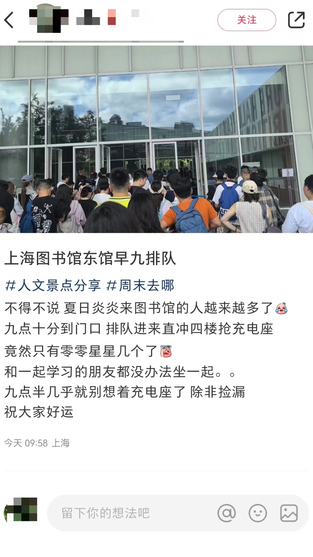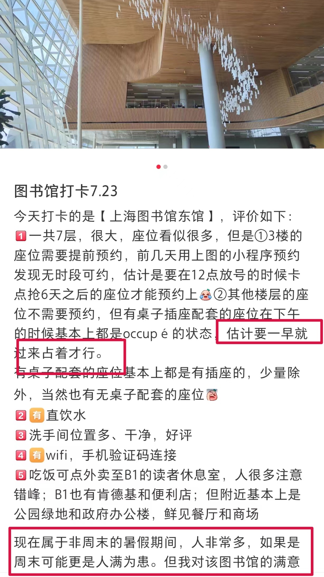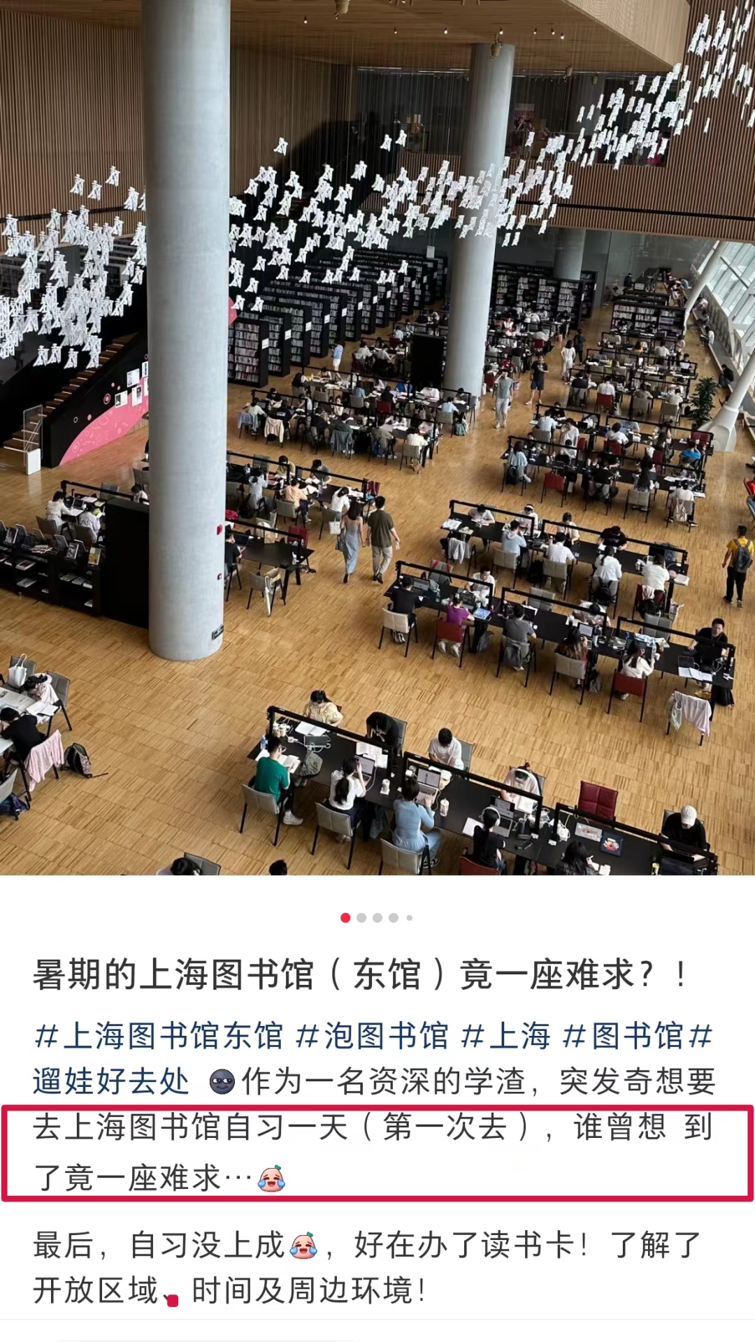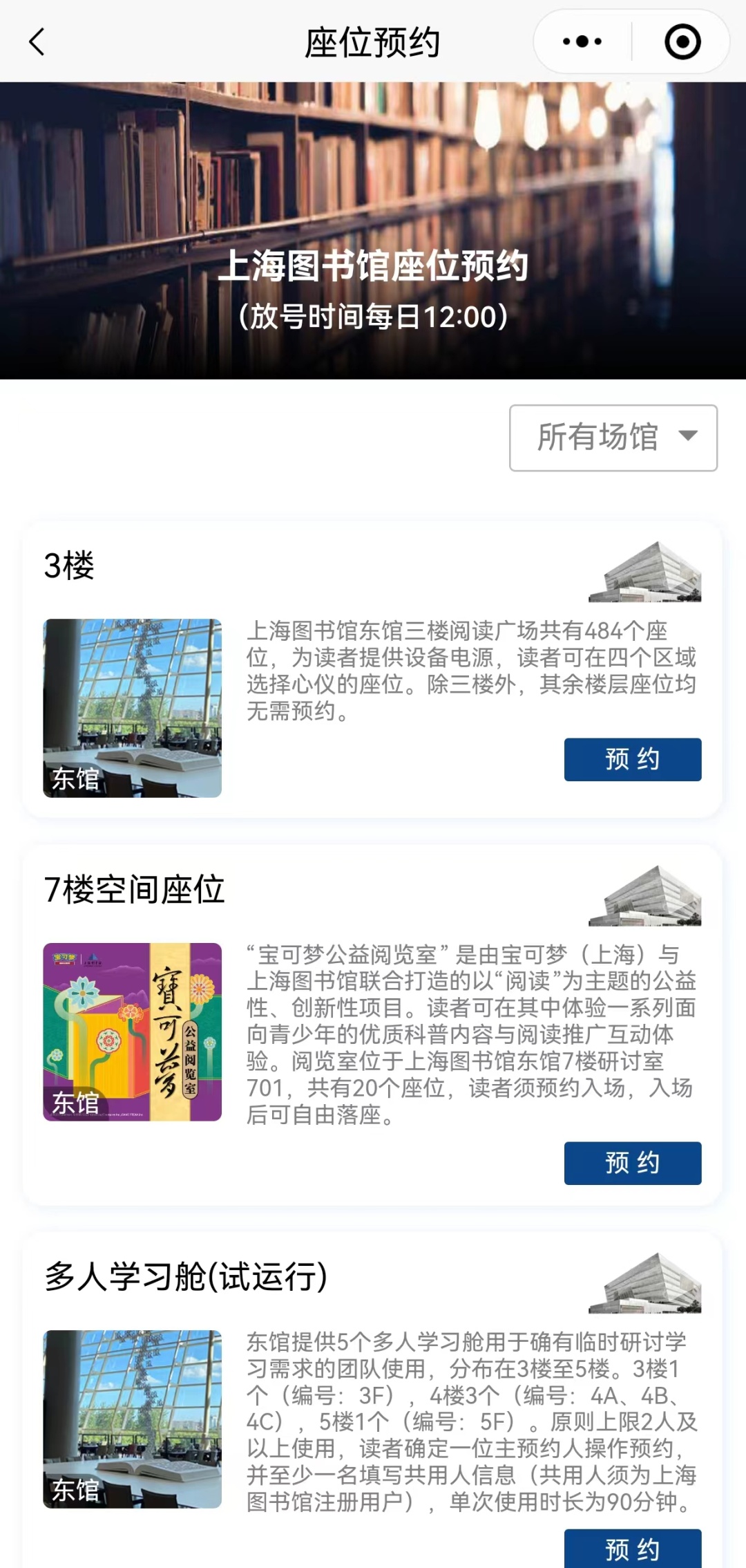 对此,上海市文化和旅游局对此问题作出回应:上海图书馆东馆目前需要预约使用的是位于3楼阅读广场的484个座位。因其配套独立插座,设施较新,受到读者追捧。读者可在小程序上自行预约或取消预约座位。座位预约为7日内分时段预约,读者可通过“上海图书馆”微信小程序登记信息、挑选座位,一个绑定手机号一次仅限预约一个座位。单个座位全天分为3个预约时段,单次使用时长为3.5小时。