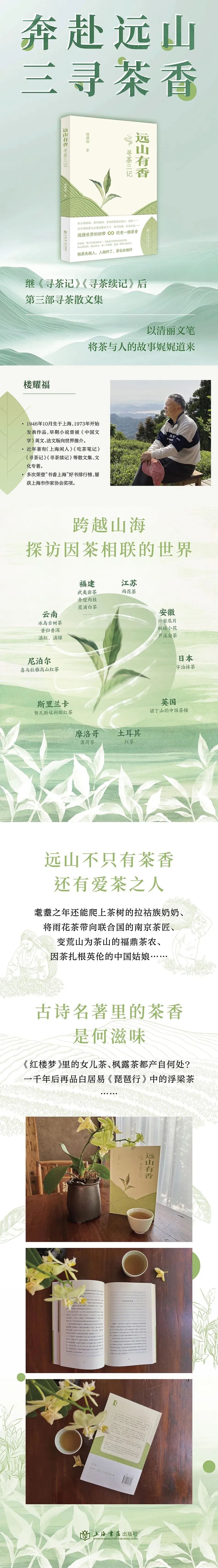 《远山有香》是我《寻茶记》系列中的第三本,《寻茶三记》成了这本书的副名。之所以取名《远山有香》,只因我为写这本书,走得比之前更远。远山有香,远山有约,我与莽莽古茶山有约,与参天的千年古茶树有约,更与那里许多对茶钟情,以茶为业的茶友、茶农有约。