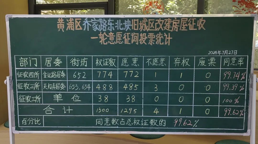 2024年7月27日上午,黄浦区乔家路东北块旧城区改建项目以99.62%的高比例顺利通过一轮意愿征询,这意味着该项目房屋征收工作启动。