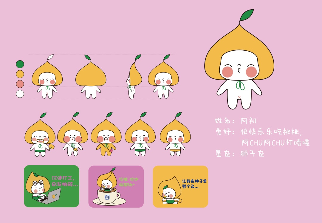 2024年,萌趣IP“阿初”惊艳亮相,成为黄桃文化的生动代表,其玩偶、包装、表情包等创意周边广受欢迎,风靡一时。