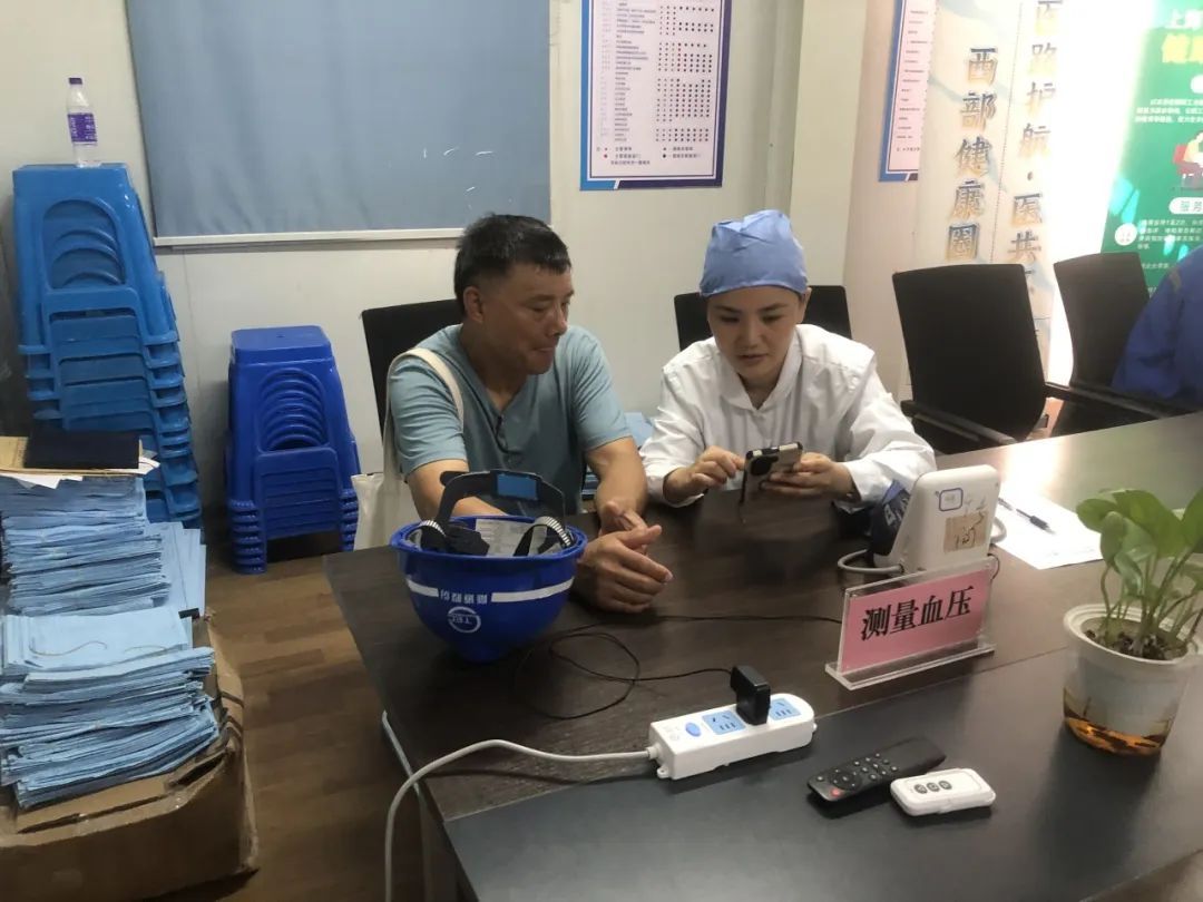 现场,医护人员们耐心地为工人们提供“一对一”问诊咨询、测量血压、仔细询问身体状况、对体检报告异常指标进行解读以及对慢性病初步筛查和诊断。同时,还根据高温季节的工作环境和特点,对一些常见的职业病和健康问题,给出了专业的建议和指导,旨在提高他们的健康意识和自我保健能力。