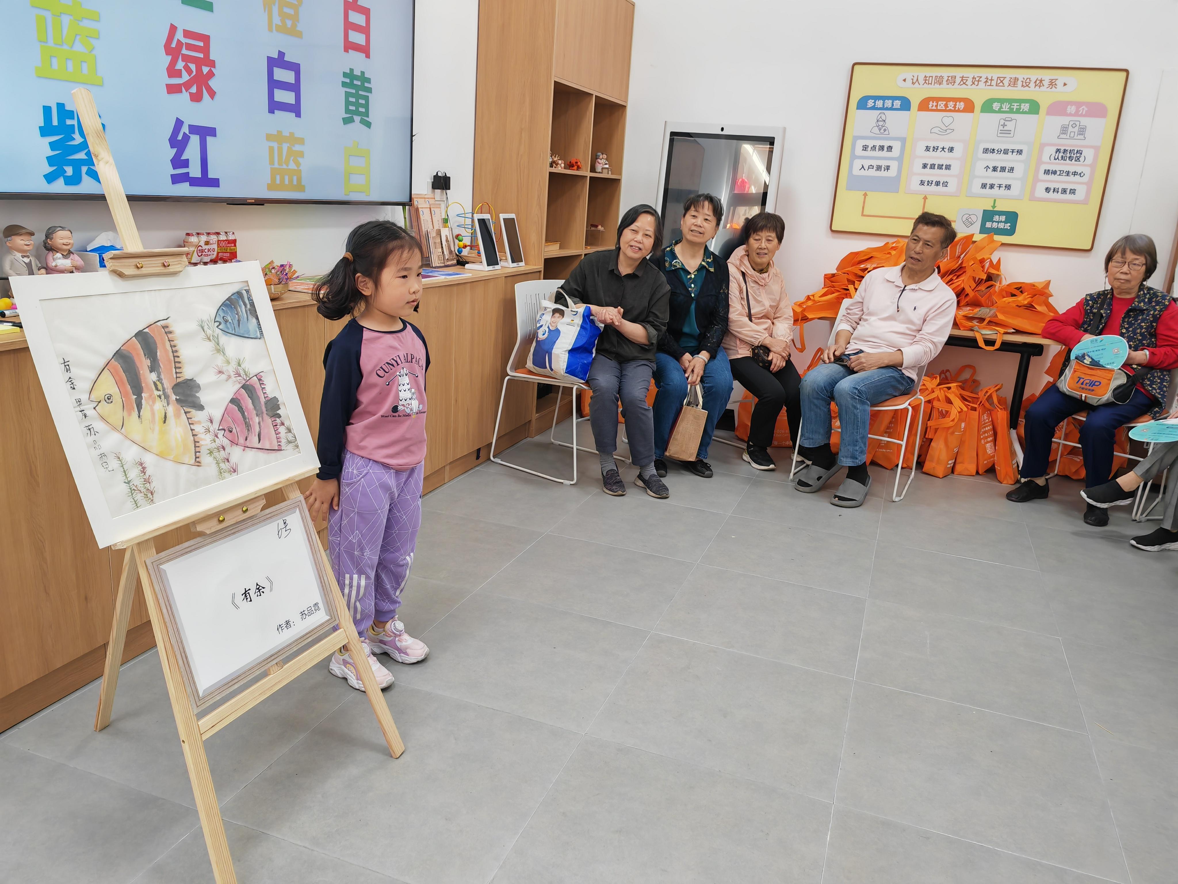 对认知障碍有了知识积累和一定的认识之后,孩子们在“小手绘大爱,认知无障碍”活动中,展示了他们的创意绘画作品。从象征长寿的寿桃,到寓意吉祥的松鹤图案,孩子们用作品把活动变成了一场温馨的迷你画展——他们逐一介绍每幅作品的意义,赢得了现场老年朋友们的阵阵喝彩和赞赏。
