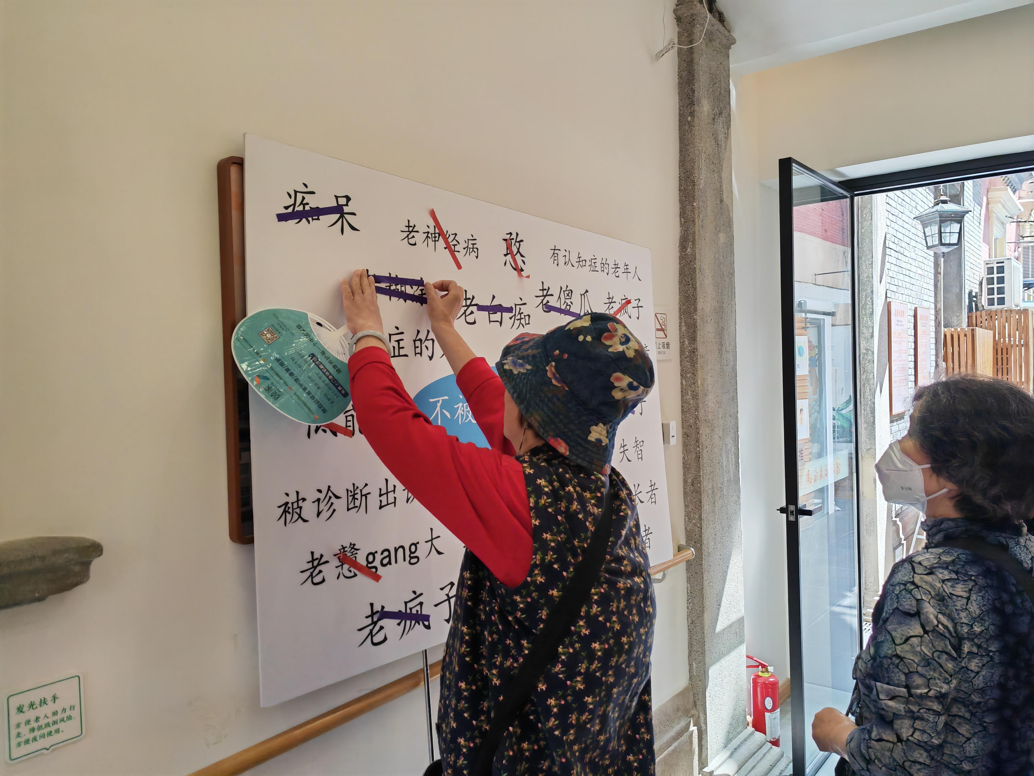 在名为“不被定义的她/他”的互动活动中,包括长颈鹿幼儿园的小朋友、社区居民等在内的参与者们,通过用彩带覆盖那些带有负面含义的词语,象征性地清除了这些贬义标签,最终留下的全是对于认知障碍长者的正面描述。这一过程不仅加深了大家对语言选择重要性的认识,同时也强化了对长者的尊重与关怀之情。