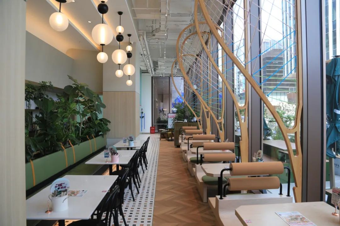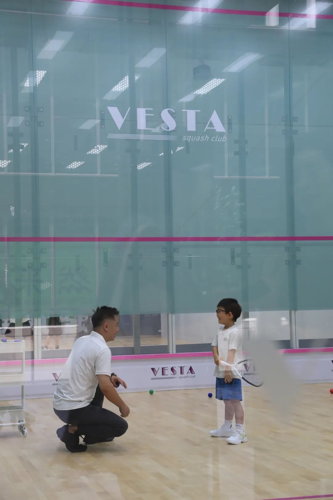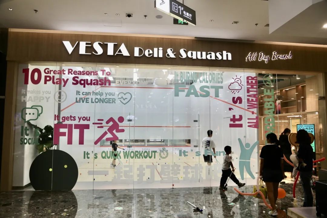 从地铁上海南站的10号口出来,步入VESTA DELI & SQUASH,一边的餐桌以壁球拍样子的装饰分隔开,上墙的高清电视正播放着壁球比赛,另一边则是沙发类的餐椅,更有一份悠闲松弛感。再往内走,则是两个标准的壁球场地,一旁的台阶座椅是等候场地的伙伴或陪同孩子练习的家长的休息区,墙上均是以壁球元素作装饰,耳目一新。走道的尽头,是VESTA DELI & SQUASH在徐汇万科广场内的入口,从商场内透过玻璃可以看到正在跟着教练学习壁球的孩子,这也让不少路过的行人想要进来一探究竟。