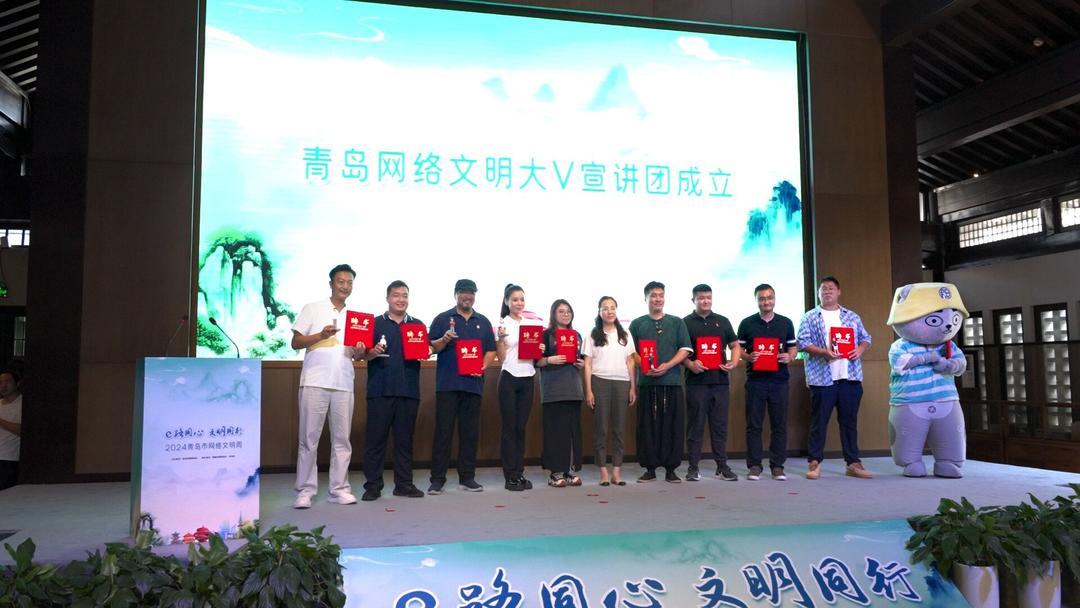 随着活动的深入,一场庄严而富有意义的网络文明倡议书宣读仪式缓缓展开。青岛市委网信办副主任朱益玲亲自上台,为网络文明素养微课堂的10位出镜网络大V颁发了青岛网络文明大V宣讲团成员证书及专属IP形象,这不仅是对他们过往贡献的认可,更是对未来网络文明传播工作的期许与信任。
