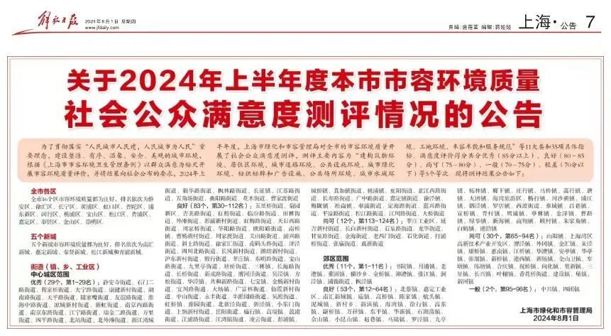 根据测评结果,全市16个区市容环境质量排名依次为静安区、徐汇区、长宁区、黄浦区、虹口区、普陀区、浦东新区、闵行区、杨浦区、宝山区、松江区、青浦区、嘉定区、奉贤区、金山区、崇明区。这也是自2023年以来,静安区连续第三次获得全市测评第一名!