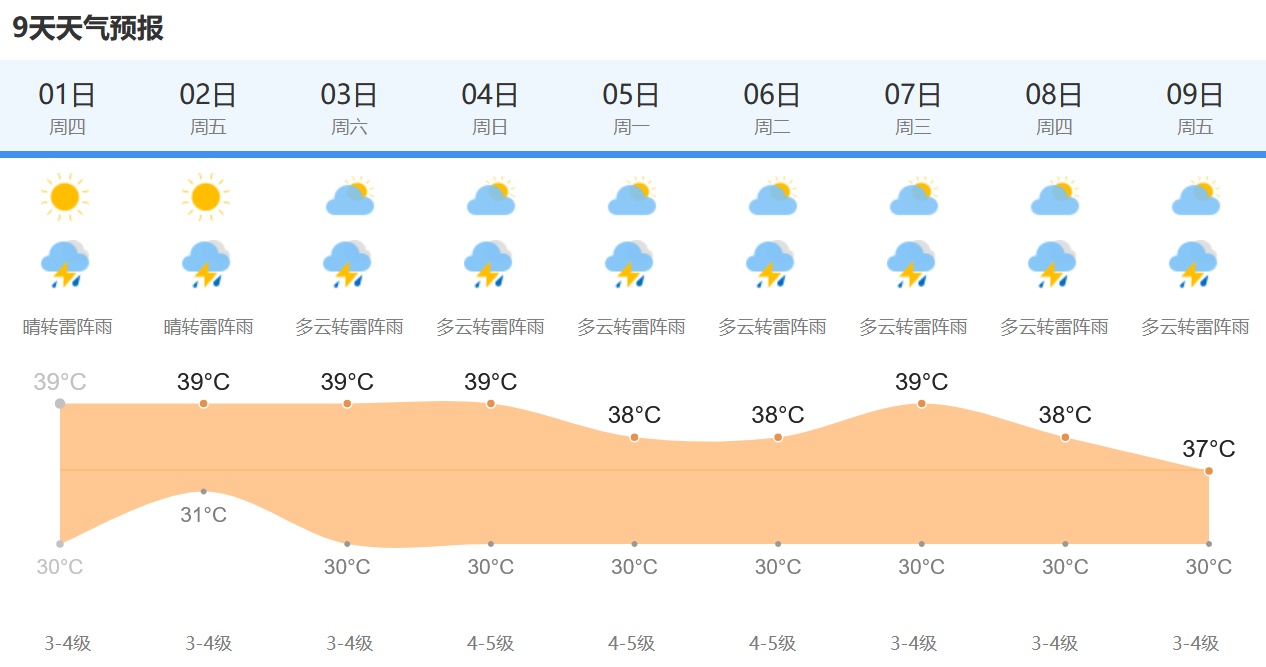 据预报,明天将延续今天的高温强度,最低气温31℃,最高气温39℃。晴到多云,明天的午后局部地区阴有阵雨或雷雨。西南风转偏西风,风力3-4级。未来一周,高温持续时间长,公众需做好防暑降温措施,午后高温时段减少户外活动,建议带好雨具出行,预防雷阵雨的出现。