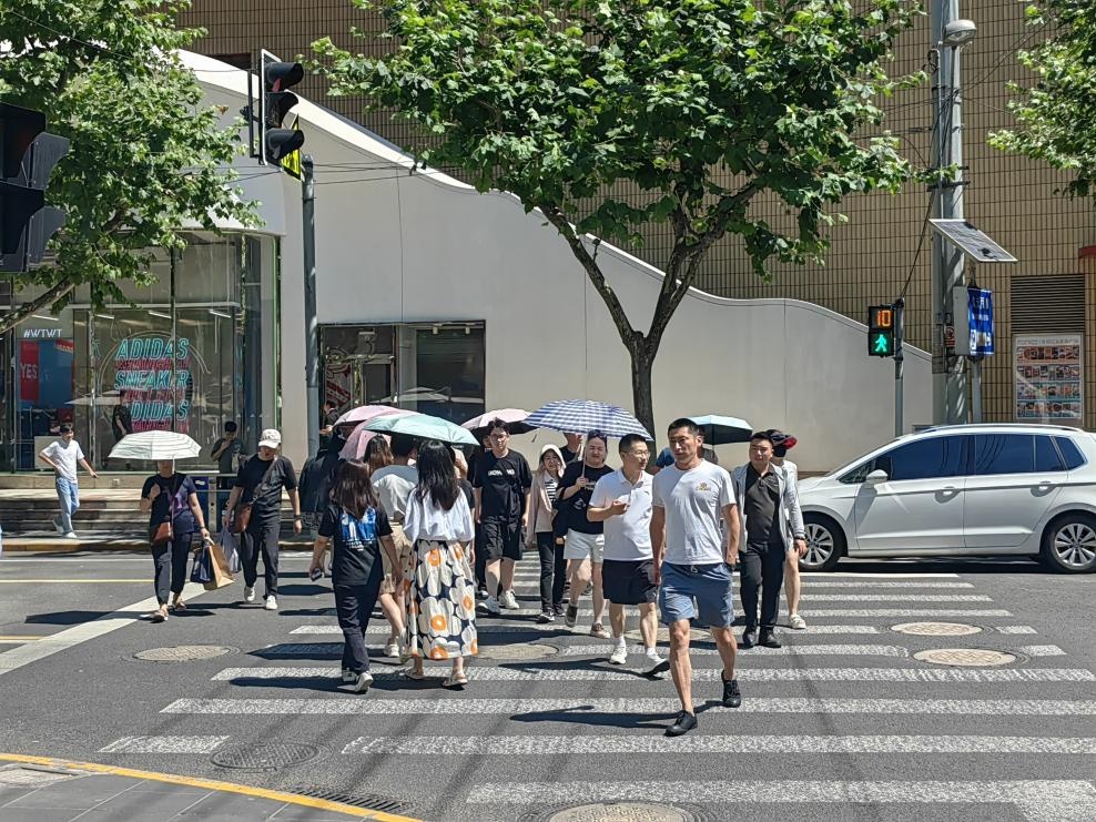 今天强烈的阳光与高温一起对人们发起了热浪冲击,防晒工作必不可少。在胶州路愚园路口的人行横道上,出行的人们都纷纷撑起了遮阳伞进行防晒。