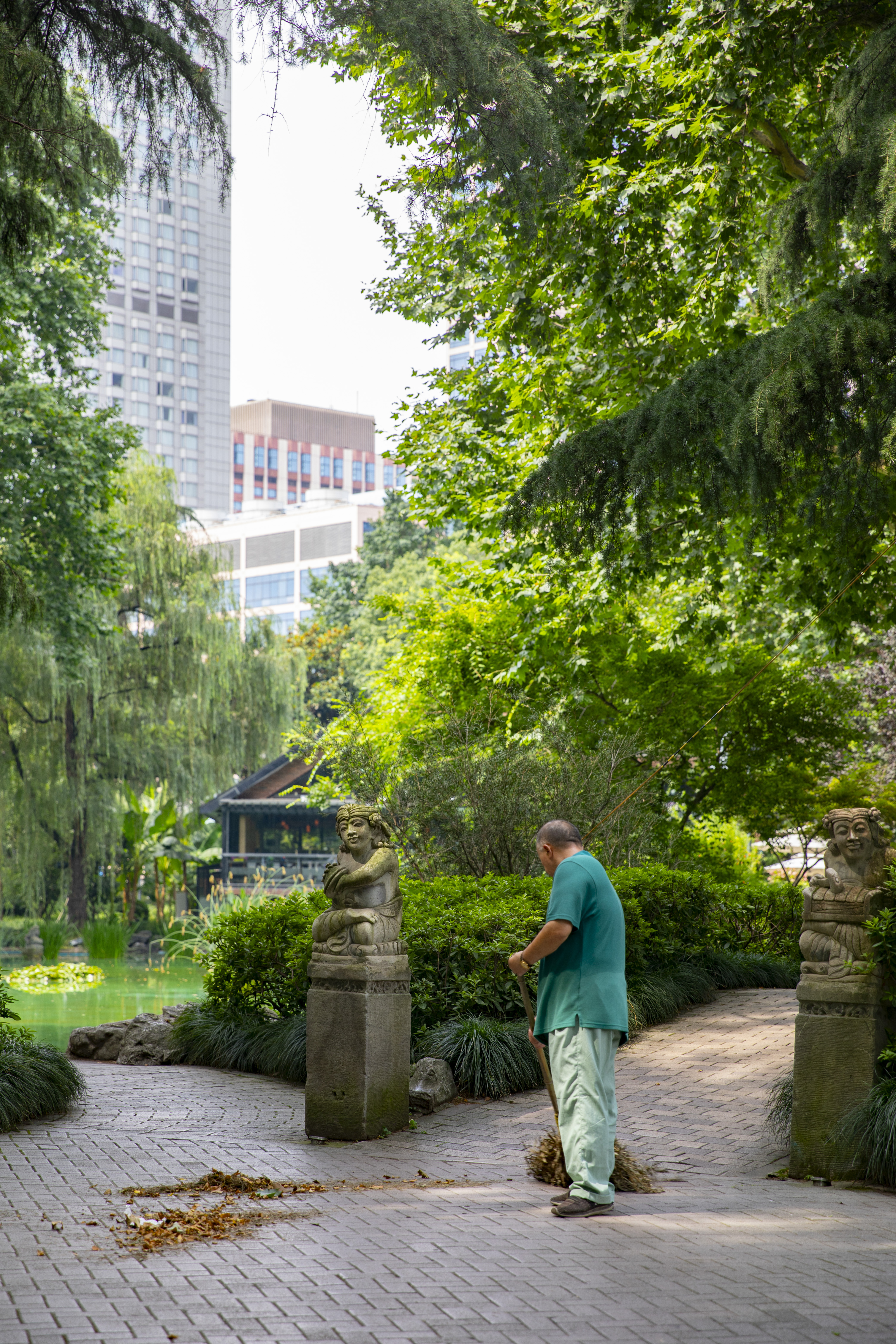 静安公园内,蝉鸣不断。虽有树木遮挡,但也难抵热浪,环卫保洁人员的上衣也已被浸湿!