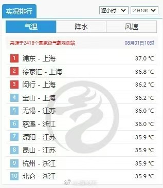 从上午8点开始,上海就占据了全国气温榜的榜首,“上海一大早热到全国第一”的词条也由此冲上了微博热搜。上午10点,浦东、徐家汇、闵行的气温分列全国气温榜的前三位,最高气温达到了37℃。