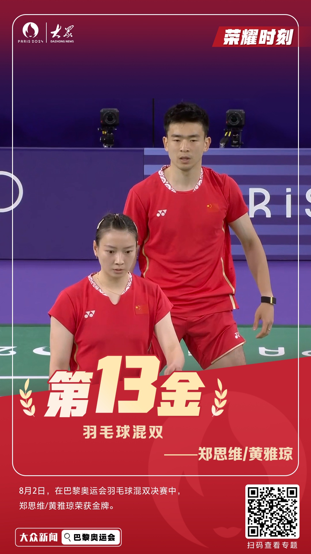 当地时间8月2日,在巴黎奥运会羽毛球混双决赛中,中国队组合郑思维/黄雅琼战胜韩国队组合金元昊/郑娜恩夺得金牌。这是中国代表团在本届奥运会获得的第13枚金牌。