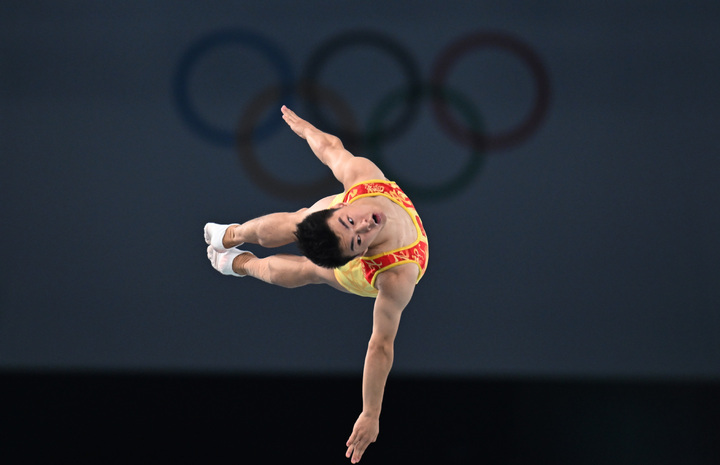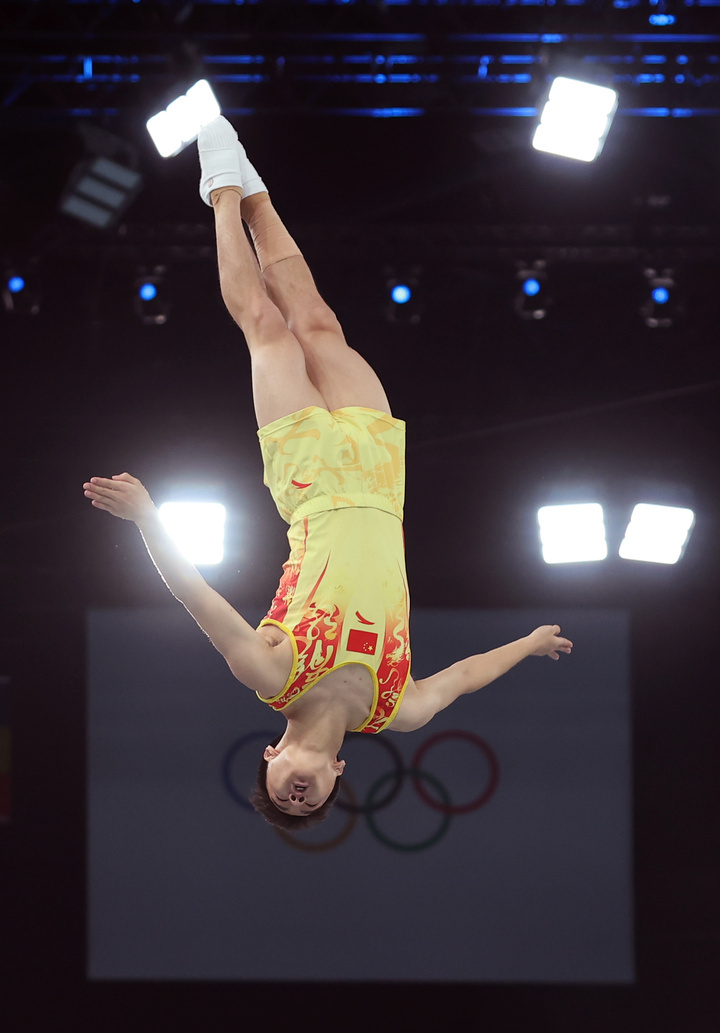 江苏运动员王梓赛在巴黎奥运会男子蹦床比赛中