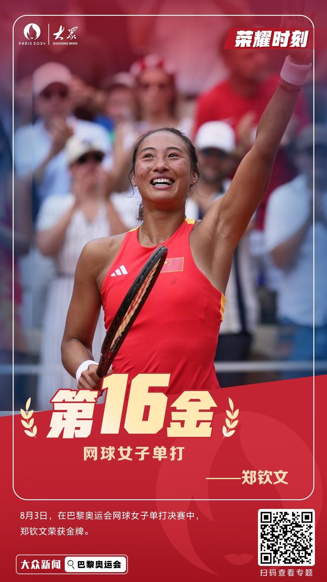 北京时间8月3日,在巴黎奥运会网球女单决赛中,21岁的郑钦文击败克罗地亚球员维基奇夺得金牌,成为中国首位奥运网球单打冠军。这也是中国代表团在本届奥运会获得的第16枚金牌。