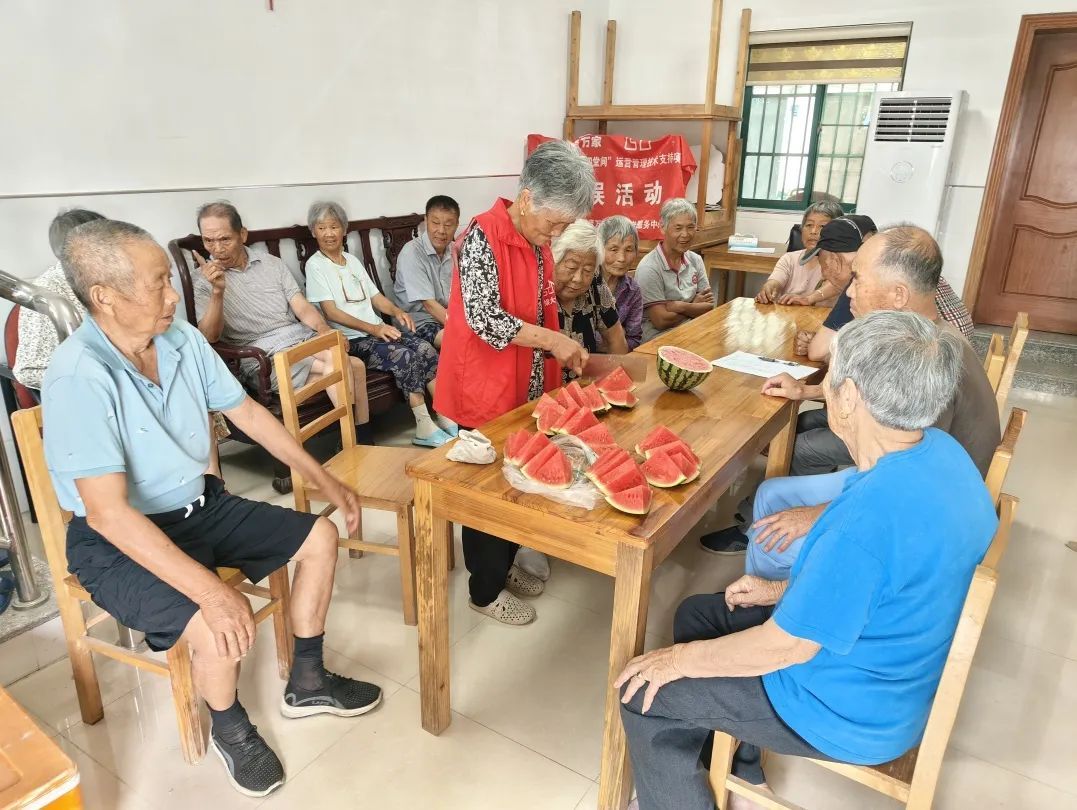 南桥镇为前来纳凉活动的老人们提供消暑西瓜,伴随着轻柔的旋律,老人们一同学习夏季按摩操的宁静时刻,悠然自得,岁月静好。