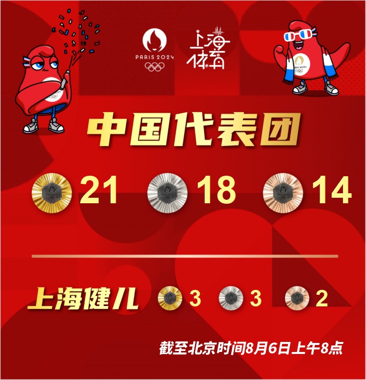 巴黎时间8月5日,中国体育代表团共获得2金3银3铜。中国射击队刷新奥运会历史最好成绩;中国体操选手邹敬园成功卫冕。至此,中国代表团以21金18银14铜重返奖牌榜第一。