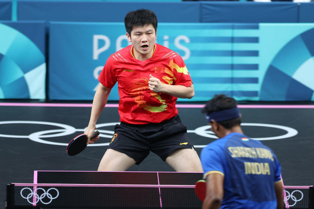 8月6日,在巴黎奥运会乒乓球男团16强赛的比赛中,由樊振东、马龙、王楚钦、梁靖崑 (P卡:替补队员)组成的中国队3比0战胜印度队,晋级八强!