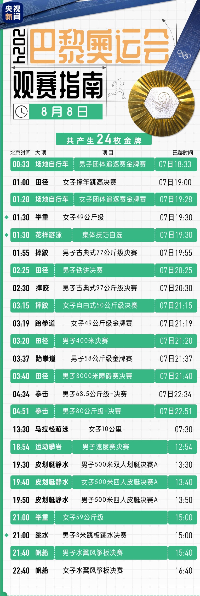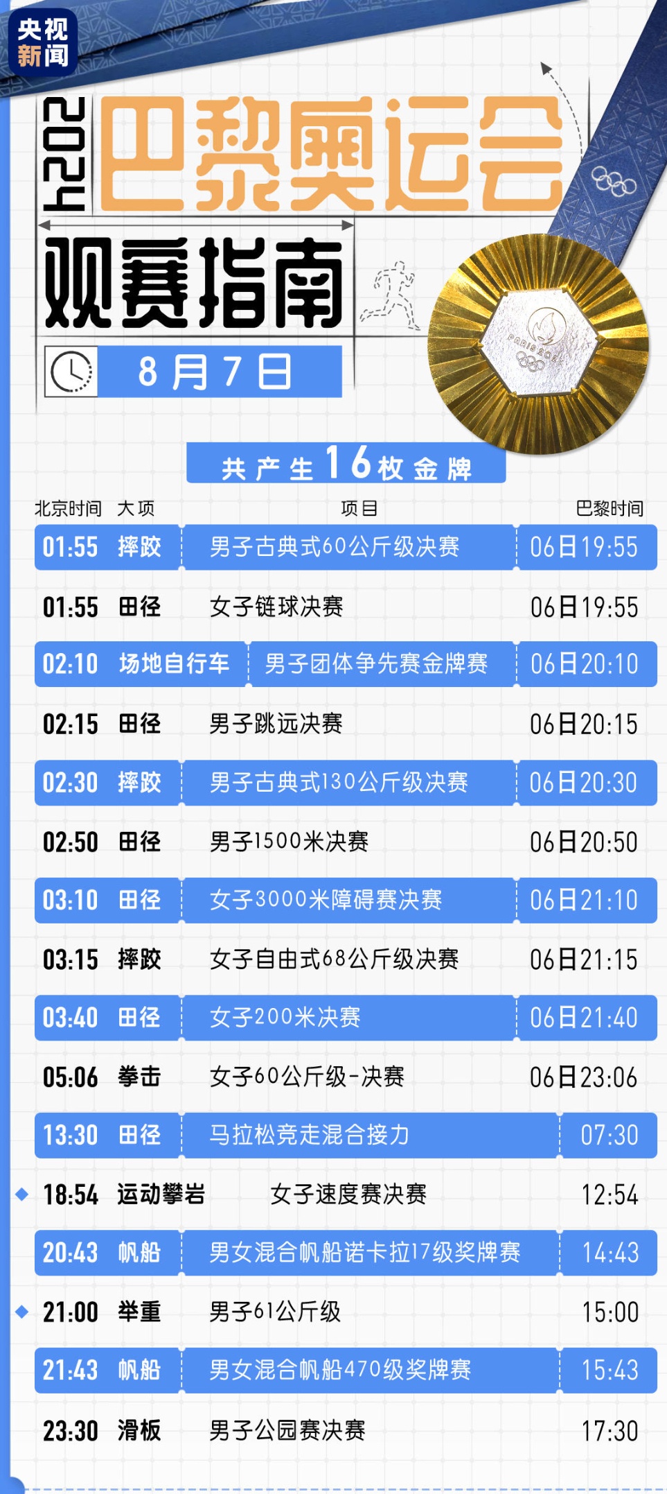 ·田径:竞走混合接力项目是奥运会新设项目,中国队有两组选手出战,刚获得巴黎奥运会女子20公里竞走金牌的杨家玉搭档张俊,伦敦奥运会女子20公里竞走冠军切阳什姐搭档贺相红,将为中国队全力冲金。